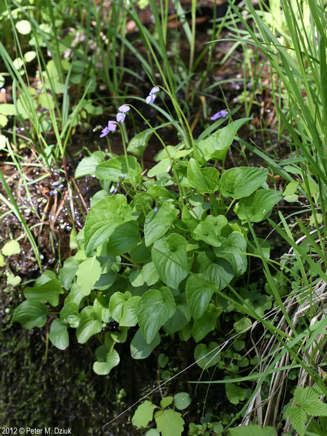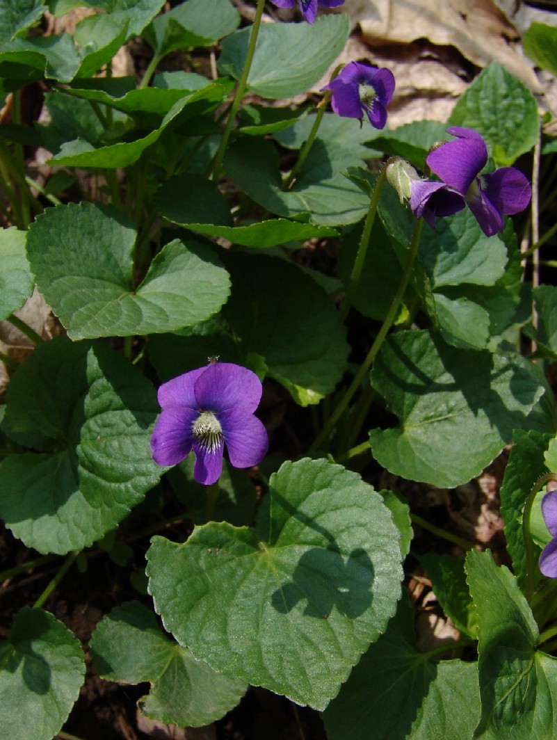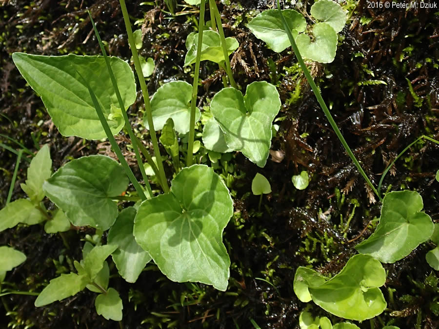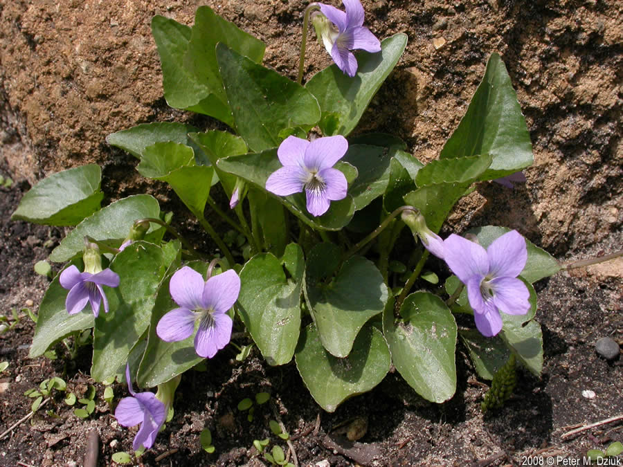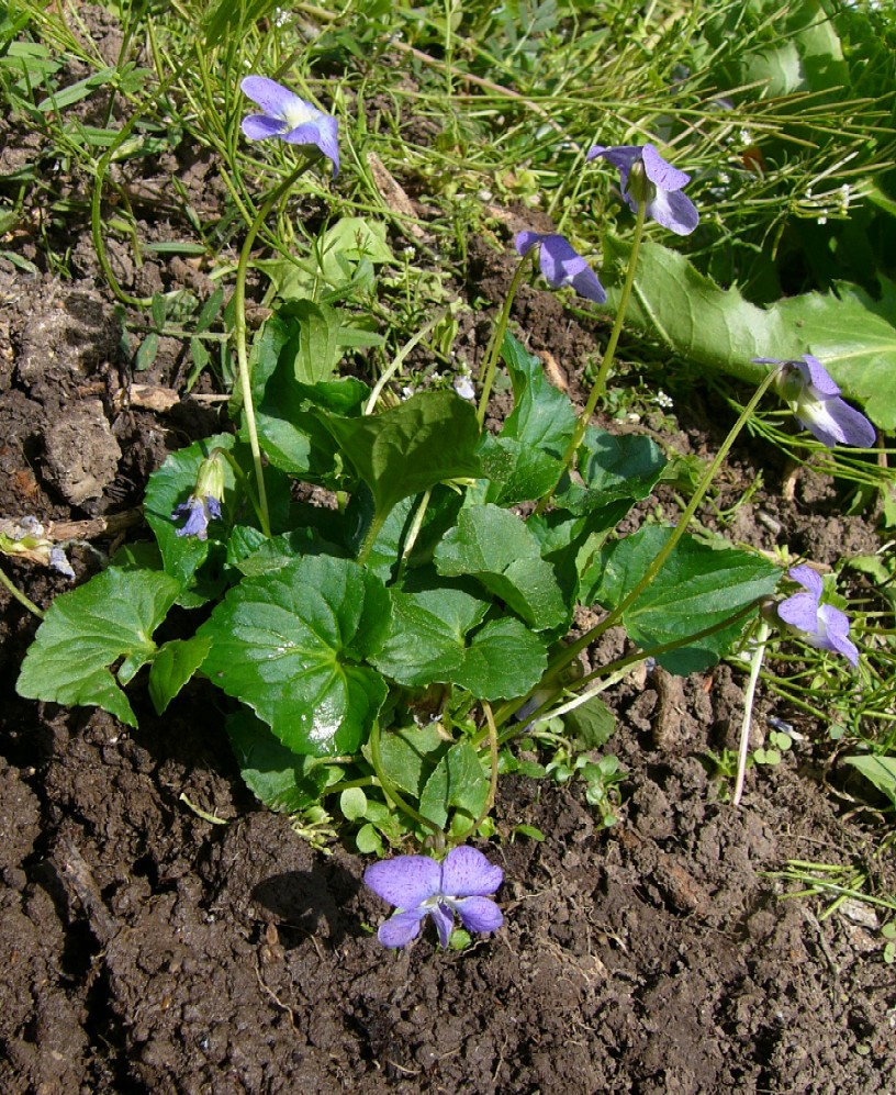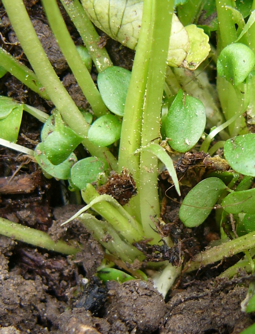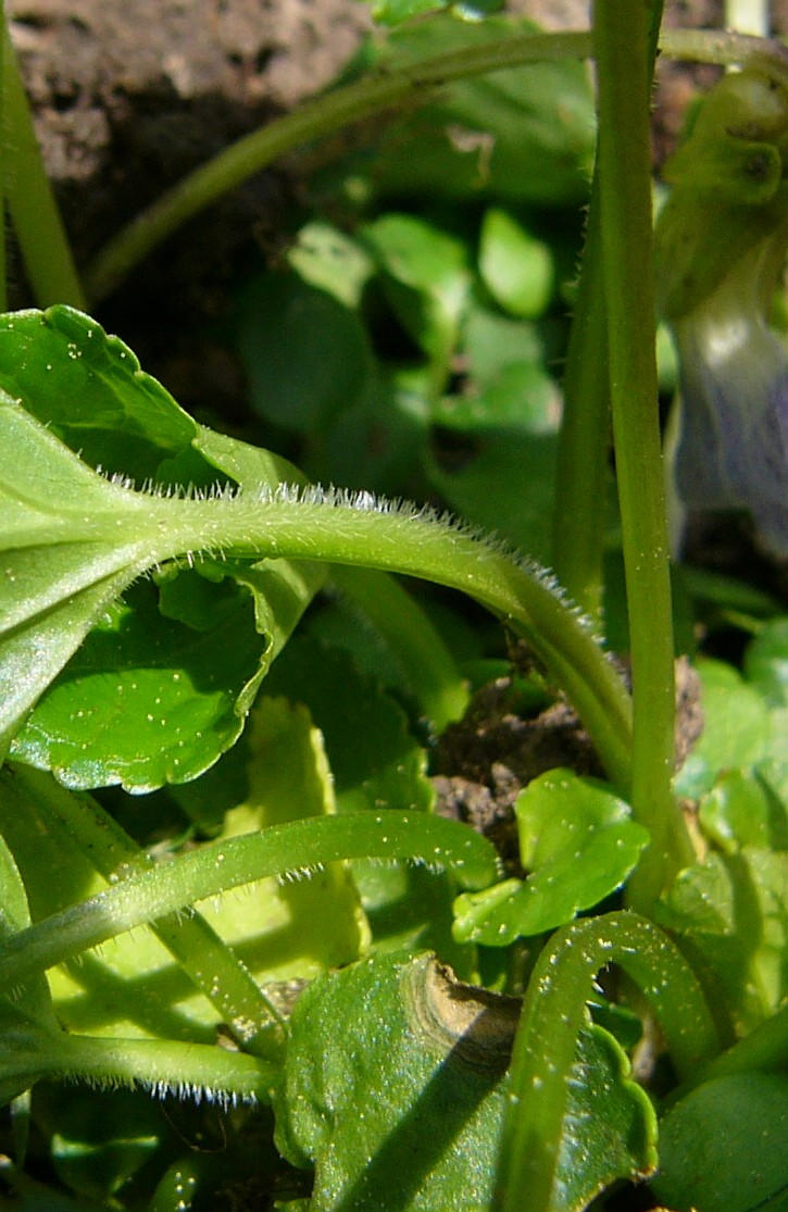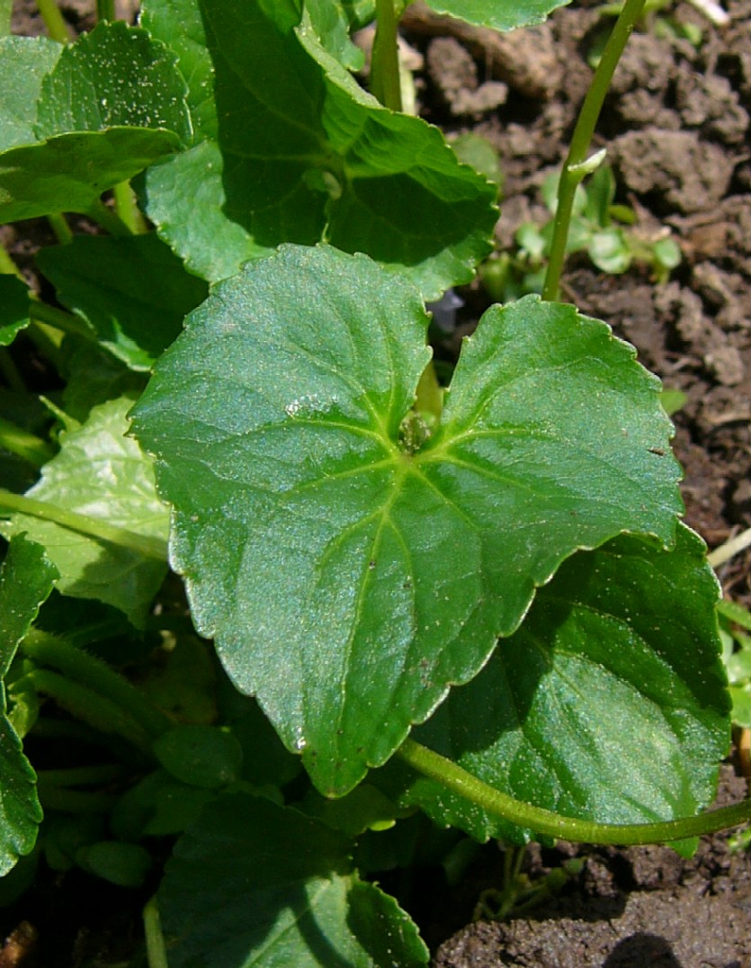 Grundblätter gestielt, Blattspreite ei- oder nierenförmig, 3 - 11 cm im Durchmesser, auf der Fläche kahl, am Rand gekerbt, bewimpert, am Grund herzförmig