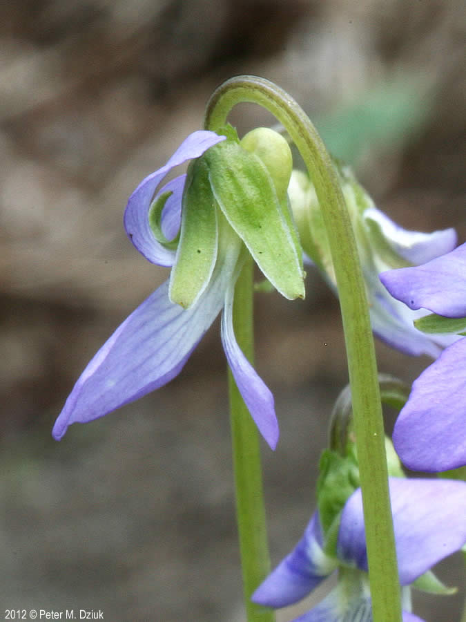 blau/violett, gefleckt, seitliche Kronblätter abwärts gerichtet, Kelchblätter stumpf,