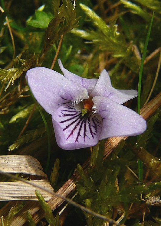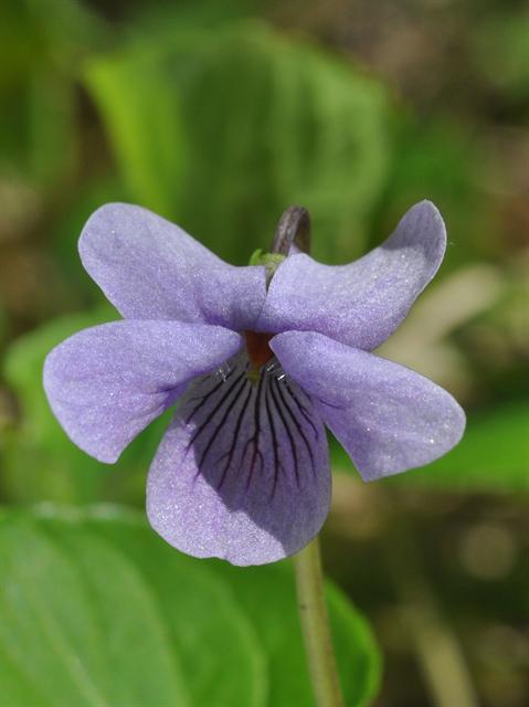 Blüten 10 - 15 mm lang, Kronblätter blassviolett, unteres Kronblatt violett geadert, Narbe gerade, nicht hakig gebogen