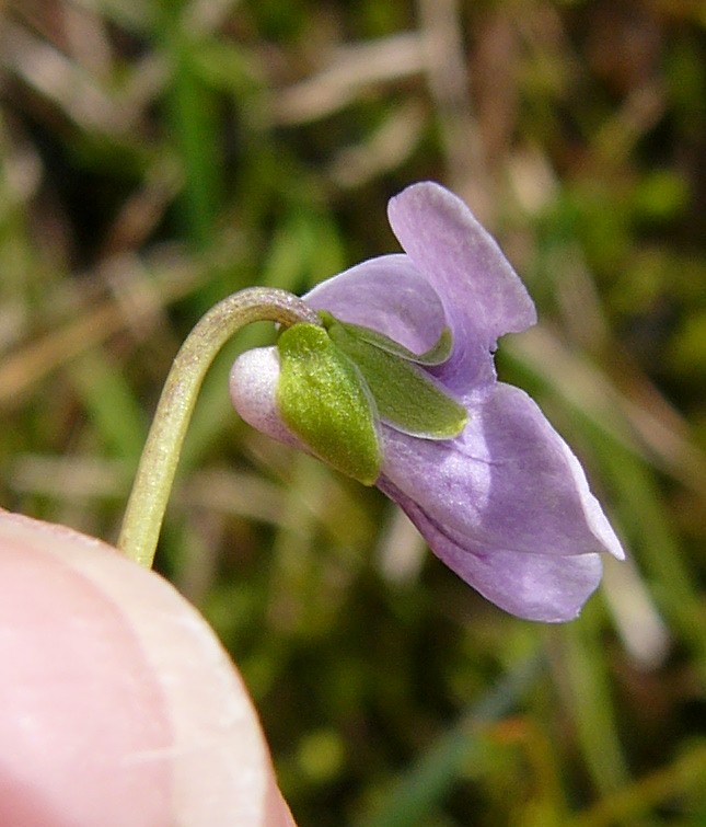 blassviolett, 10 - 20 mm groß, seitliche Kronblätter abwärts gerichtet, Kelchblätter stumpf,