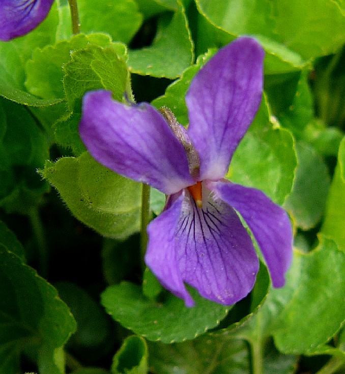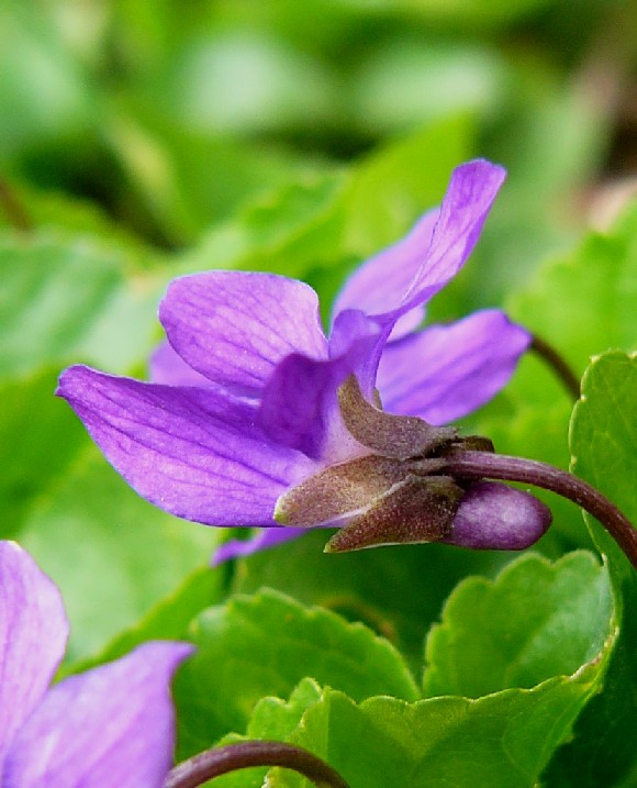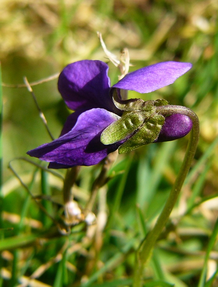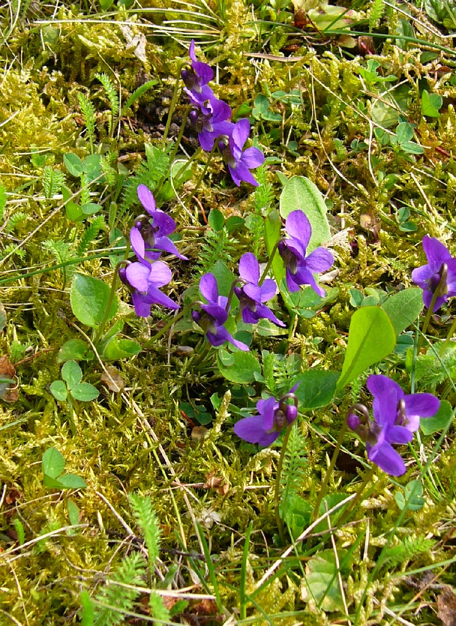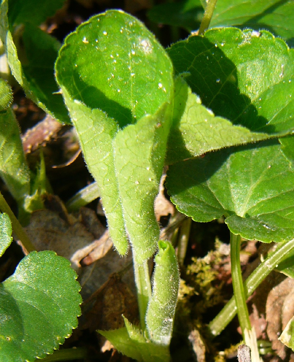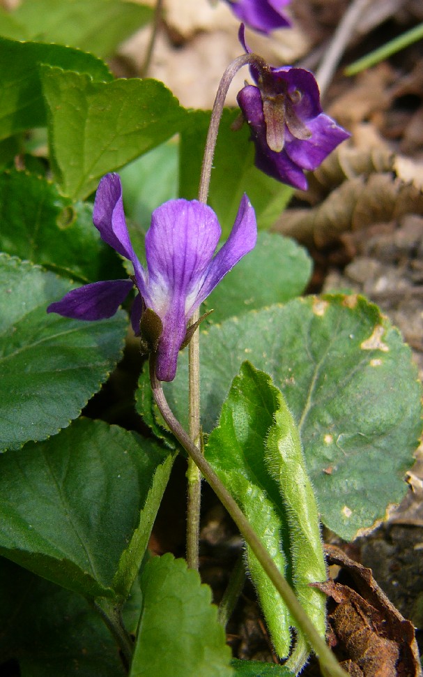 Veilchen - Blüten dunkelviolett, seitliche Kronblätter abwärts gerichtet, Kelchblätter stumpf, Blätter so lang oder länger als breit, Blüten-, Blattstiele oder Blätter behaart, Nebenblätter mit kurzen Fransen