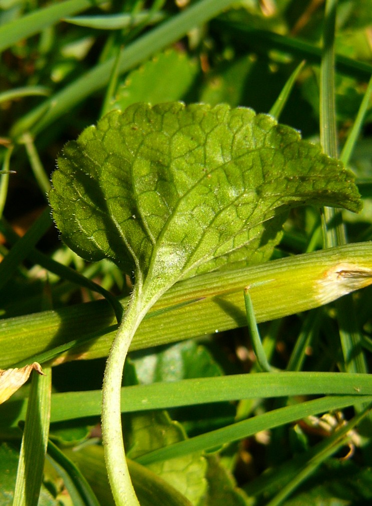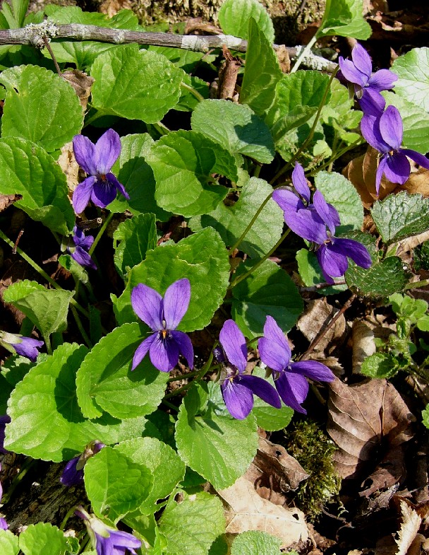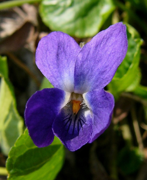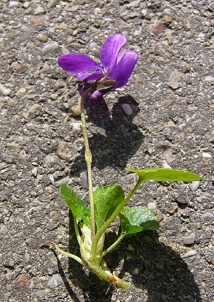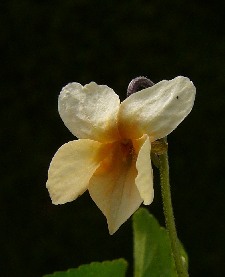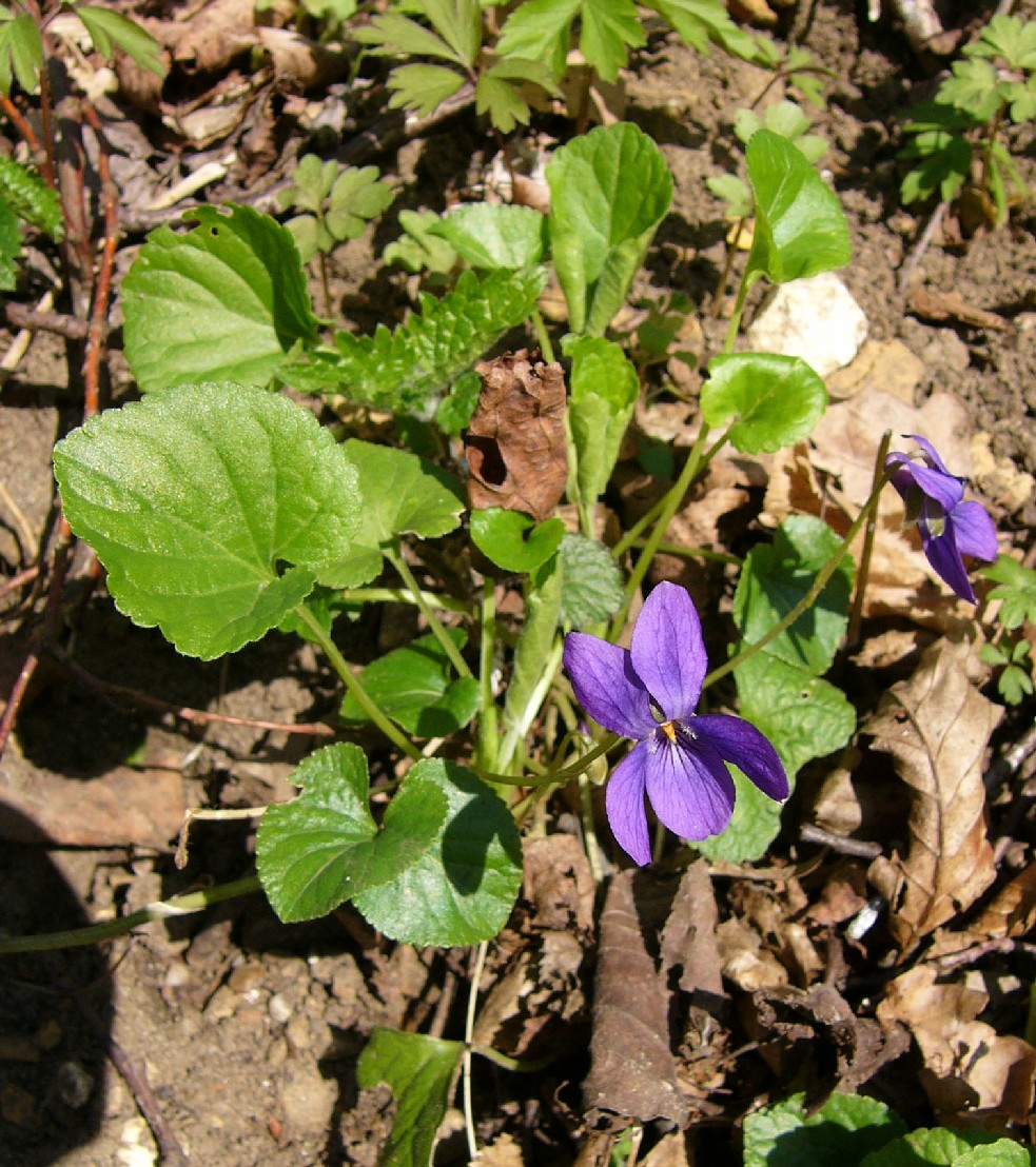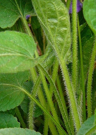 Veilchen - Blüten dunkelviolett, seitliche Kronblätter abwärts gerichtet, Kelchblätter stumpf, Blätter so lang oder länger als breit, Blüten-, Blattstiele oder Blätter behaart, Nebenblätter mit kurzen Fransen