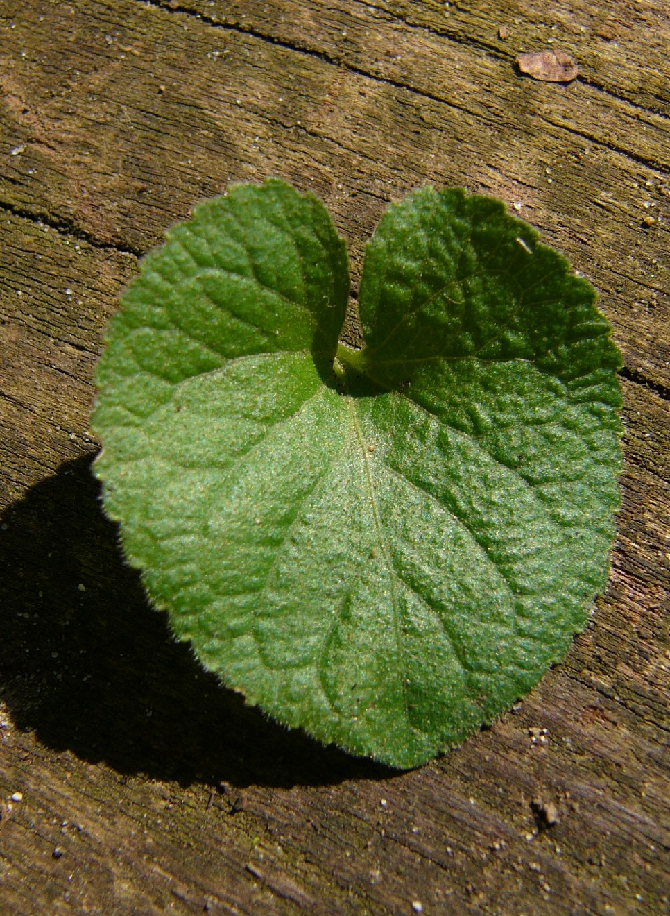 Blätter in etwa so lang wie breit, am Grund tief ausgebuchtet, vorne stumpf, oft glänzend