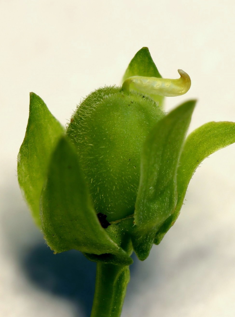 Blütenblätter reinweiß, nur das unterste ausgerandet, die beiden mittleren Blütenblätter der Lippe seitlich angelegt, eine Halbröhre bildend