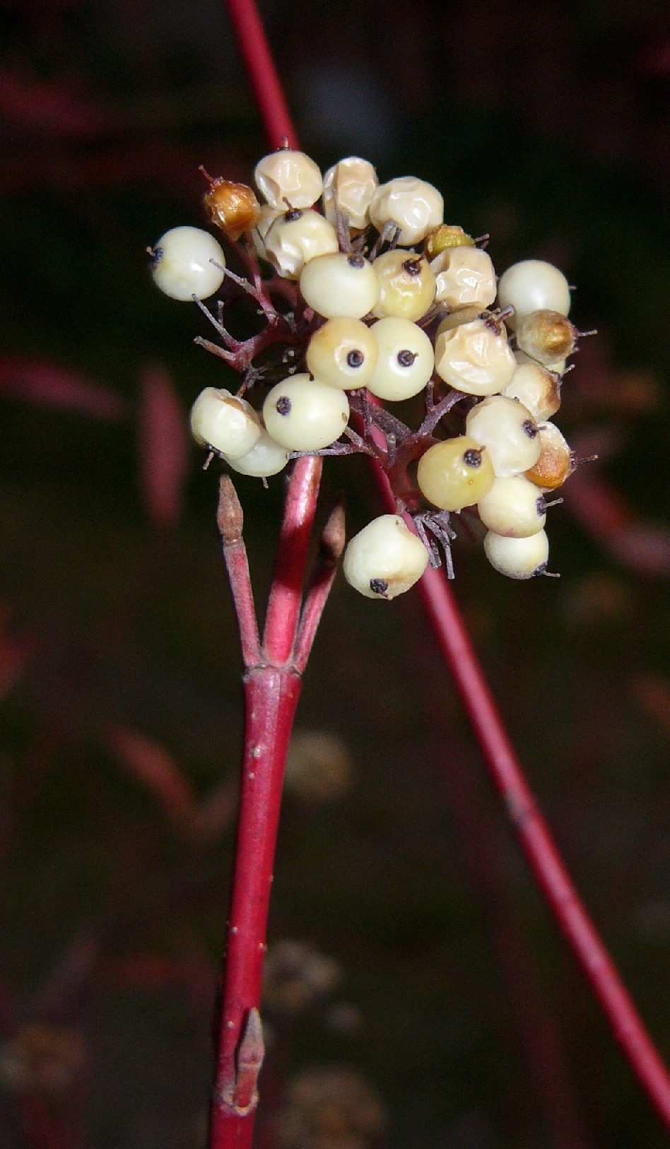 Steinkern länglich, an beiden Enden zugespitzt Zweige meist aufrecht, blut- oder korallenrot, anfangs oft bereift,