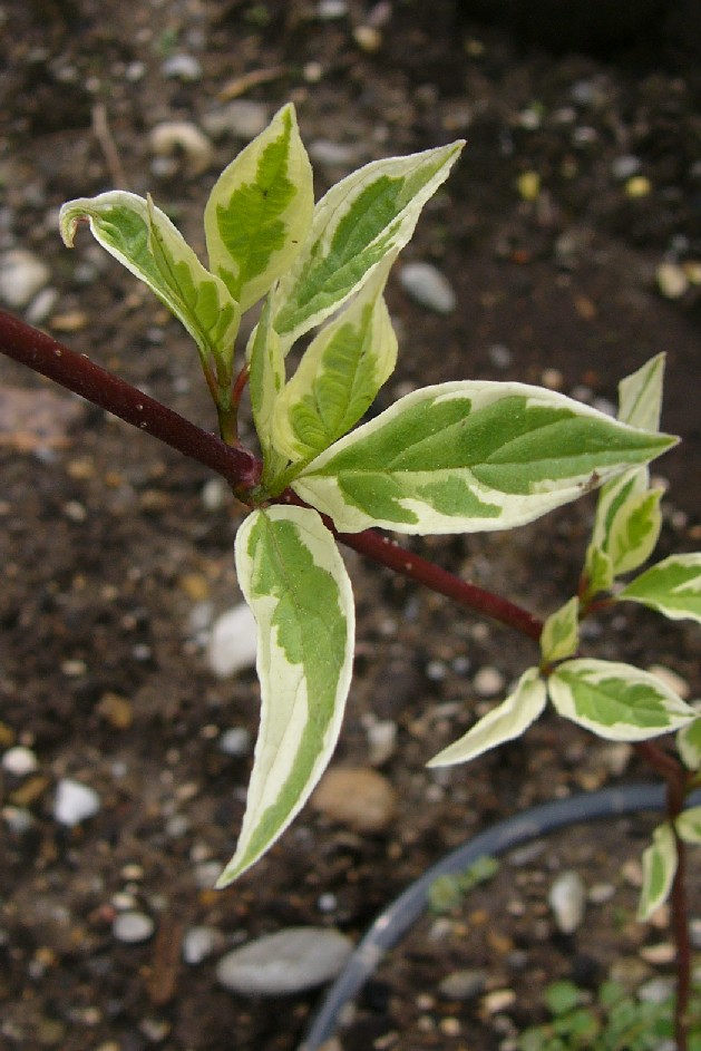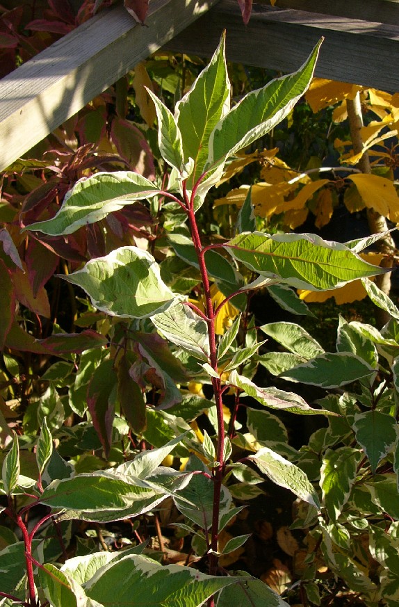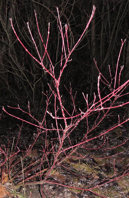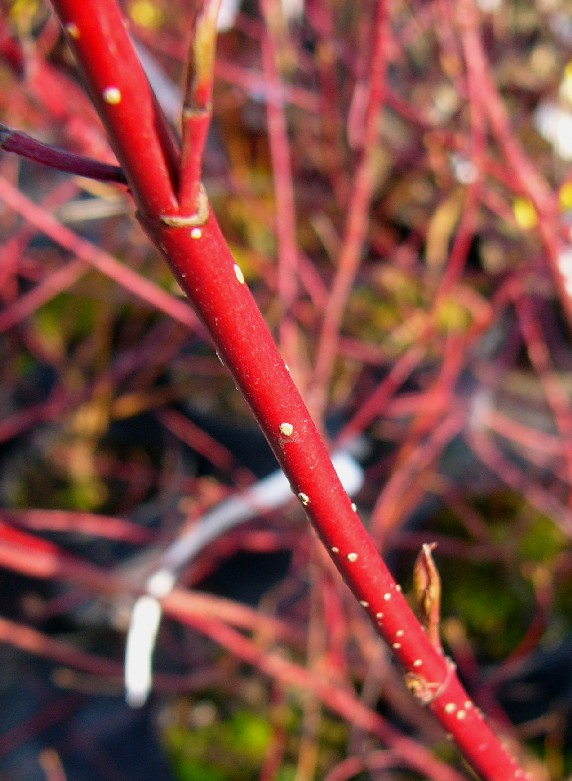 Zweige ausgebreitet bis überhängend, je nach Sorte blutrot oder gelblich, Mark weiß