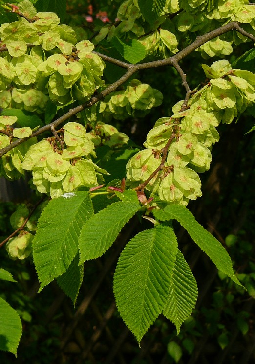 Blüten zwittrig Früchte flach, geflügelt Blattgrund asymmetrisch > Ulme (Ulmus)