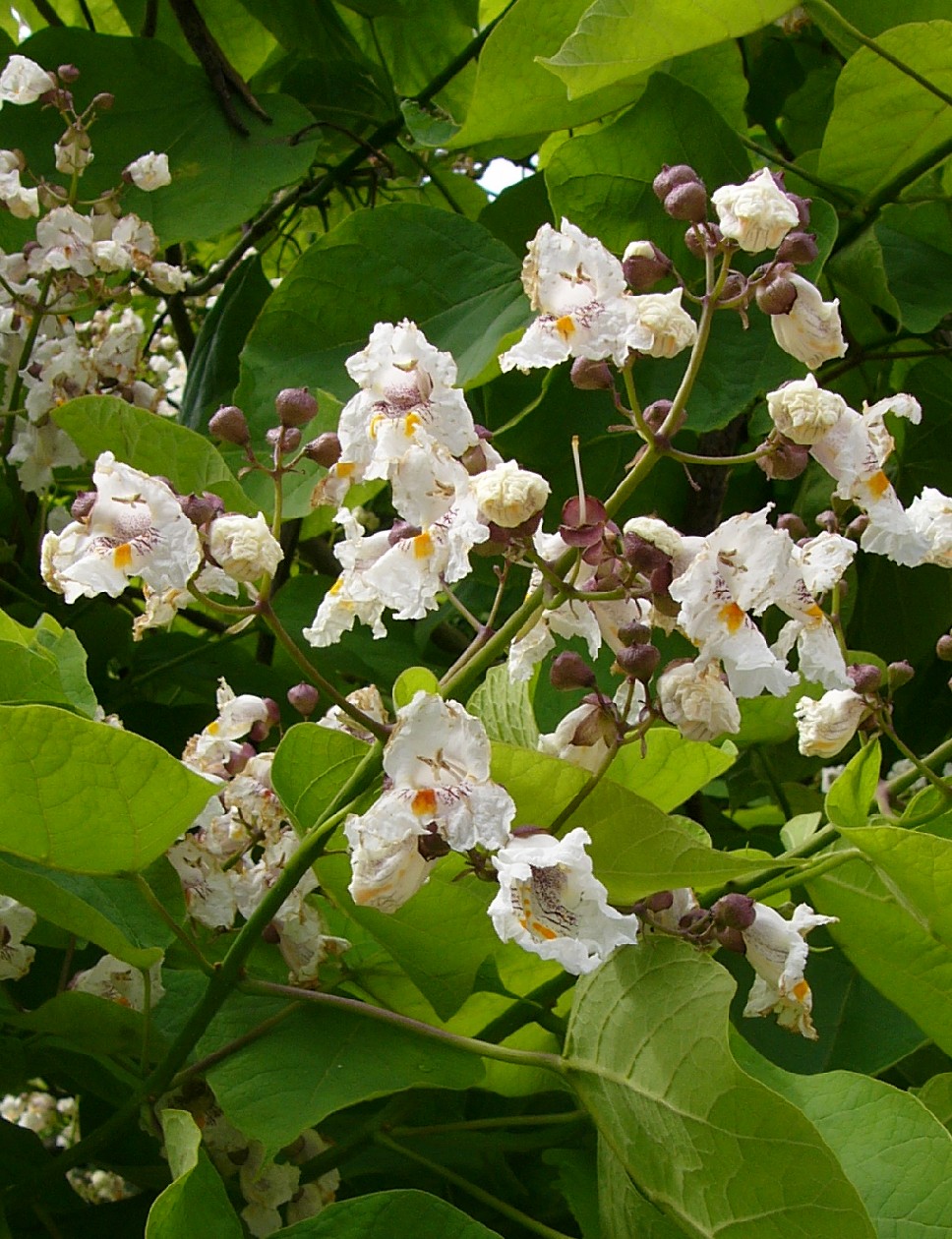 Blätter ca. 25 cm lang Blüten mit violett gezeichnetem Schlund, Bütenstiel kahl > Catalpa (Trompetenbaum) |