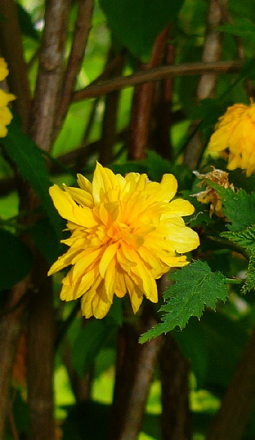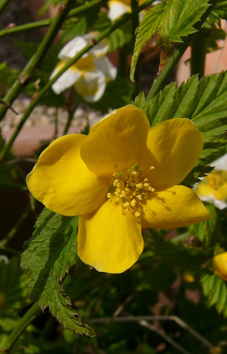 Blüten groß, einzeln Perigonblätter dottergelb, 5 oder mit gefüllten Blüten > Kerrie (Kerria) |