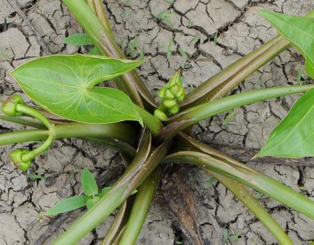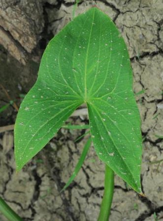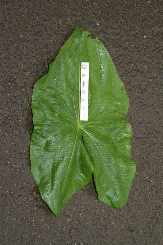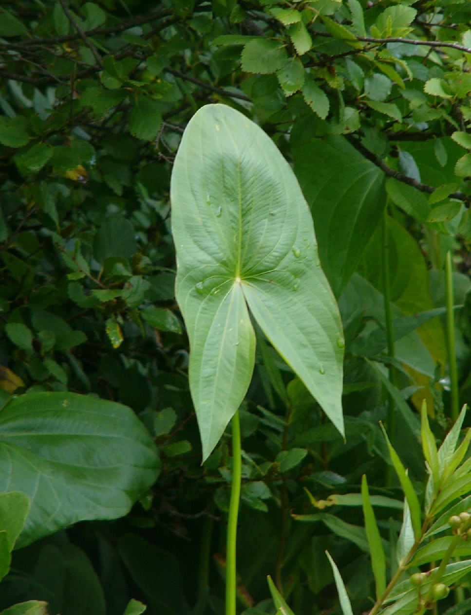 Blätter 5 - 24 cm lang und 4 - 22 cm breit, meist pfeilförig, die beiden unteren Blattzipfel so lang oder länger wie der mittlere, Blattstiele 10 - 75 cm lang, dick, weich, schwammig