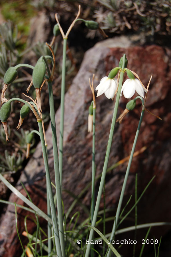 2 Verbreitung: Korsika, Perigonblätter +/- stumpf, weiß, längster Blütenstiel länger als die Spatha