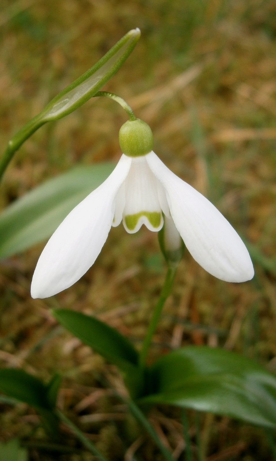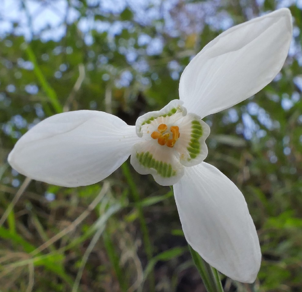 Blüten einzeln, nickend, mit 6 Perigonblättern, äußere Perigonblätter lanzettlich, meist rein weiß, innere Perigonblätter viel kürzer, ausgerandet,