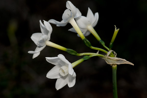 Tazetten- Narzissen. Einige Autoren sehen die Pflanze als Unterart von Narzissus tazetta, da außer der weißen Nebenkrone keine Unterschiede bestehen