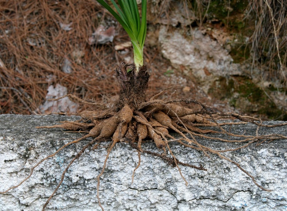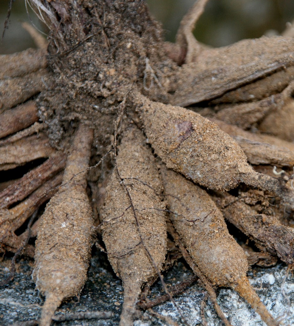 darunter die Wurzeln, die sich nach einigen cm in spindelförmige, knollige Verdickungen verbreitern