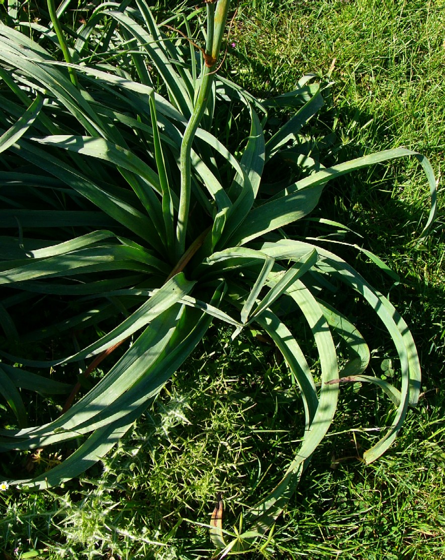 Grundständige Blätter flach, blaugrün, bis 90 cm lang, 1 - 3 cm breit