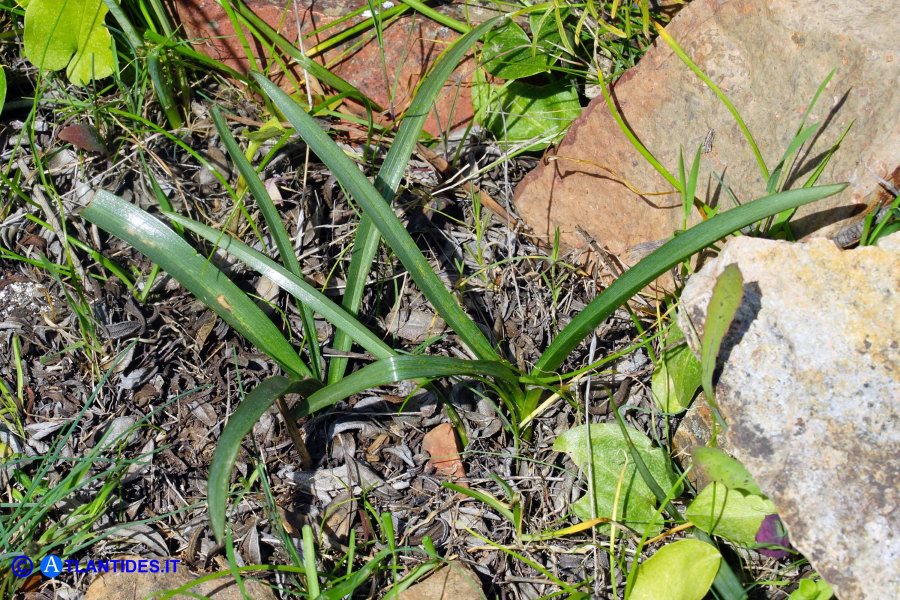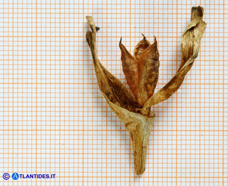 Zwiebel 10 - 25 mm lang, 10 - 15 mm breit, von dunkelbraunen, +/- membranösen Hüllen umgeben, die in einen langen Nacken auslaufend