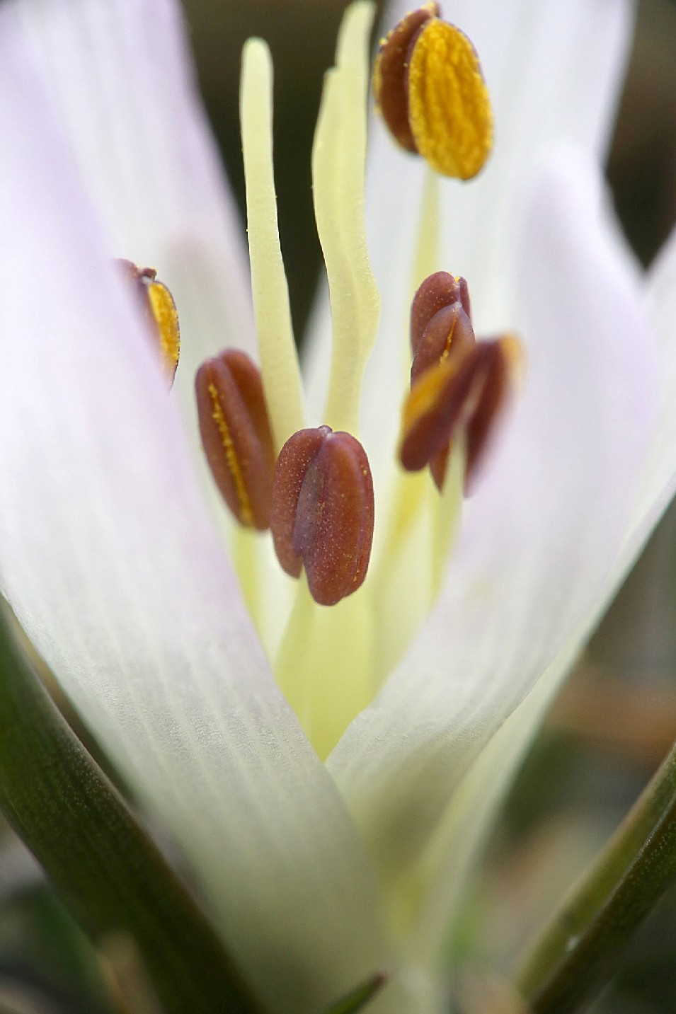 Staubblätter kürzer als die Perigonblätter, am Grund der Platte der Perigonblätter ansetzend, ohne gelben Fleck, Antheren graugelb oder violett, 2 - 3 mm lang, dorsifixed (d.h. Filamente setzen am Rücken der Antheren an), 3 freie Griffel