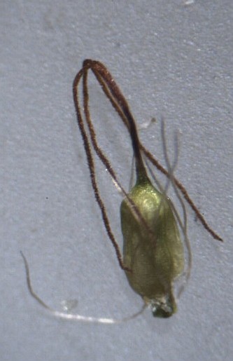 Frucht +/- dreikantig, mit Griffelrest, ohne Perigonborsten, von einem Häutchen (= Perigynum) teilweise eingehüllt