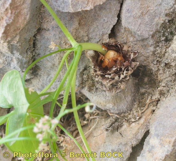 Knolle kugelig oder flaschenförmig, dunkelbraun, bis 8 cm lang, im unteren Teil deutlich dicker als im oberen