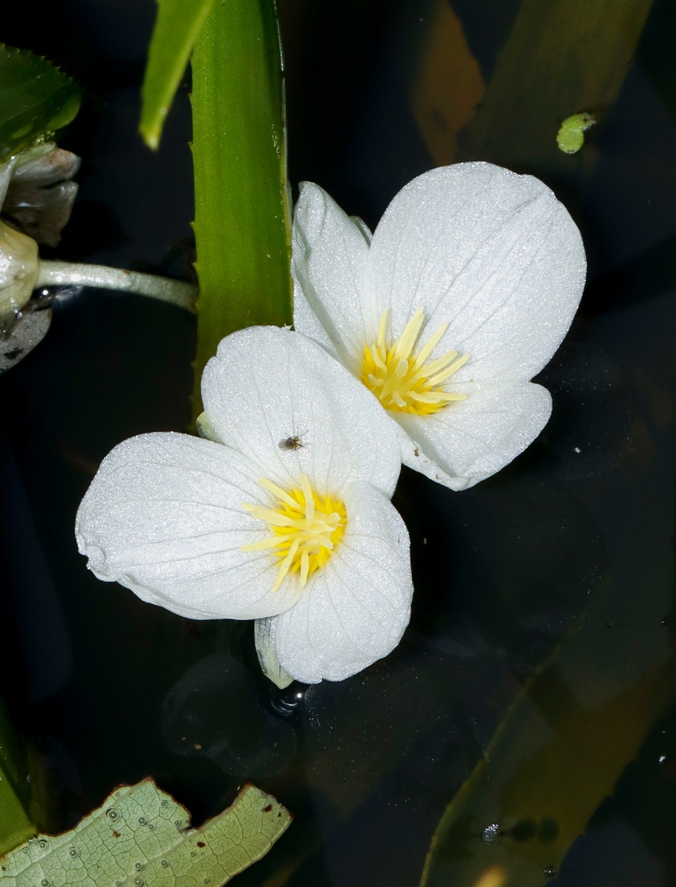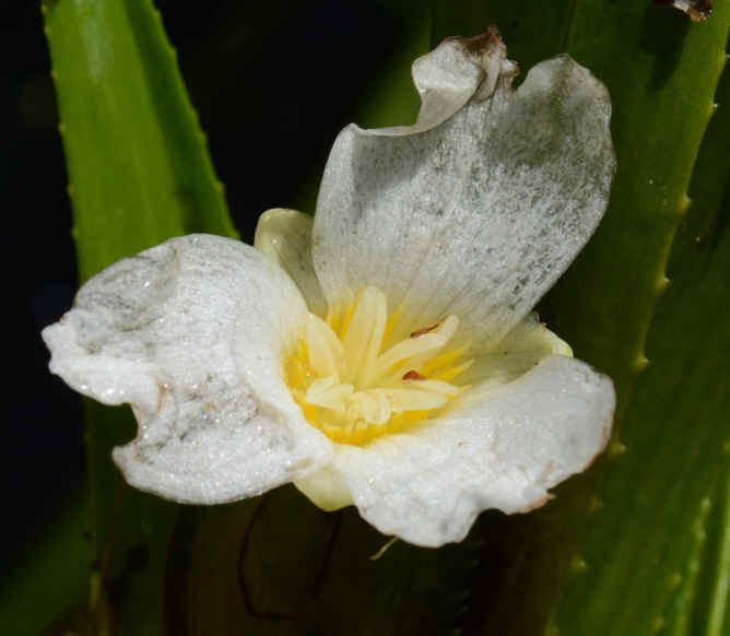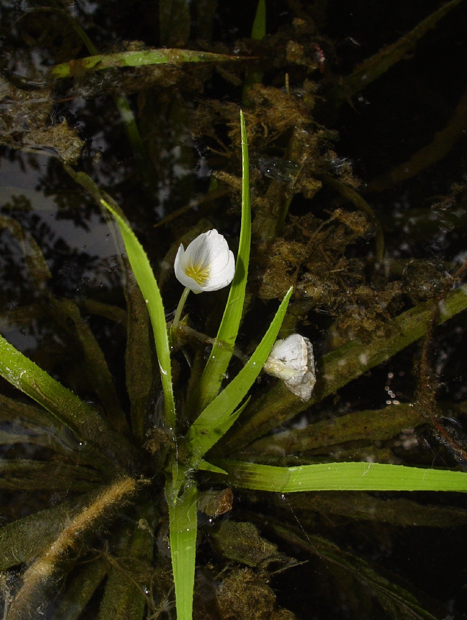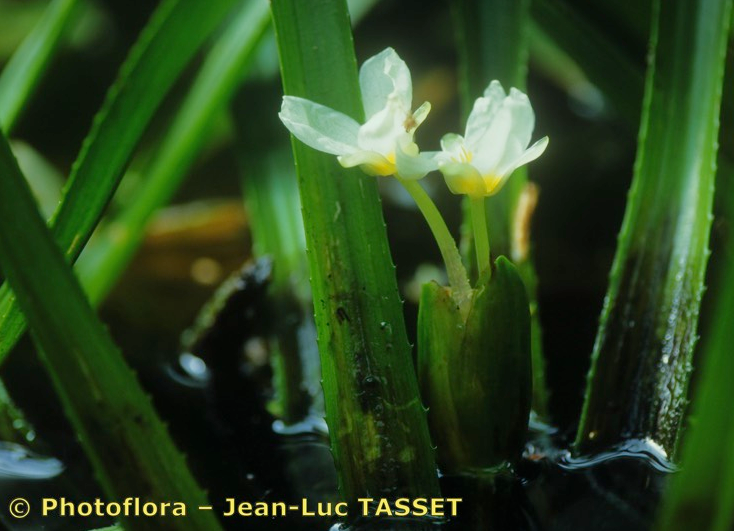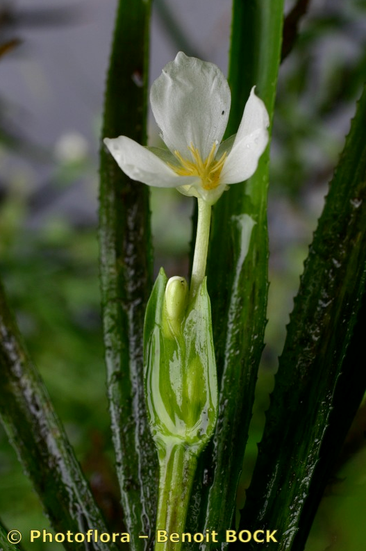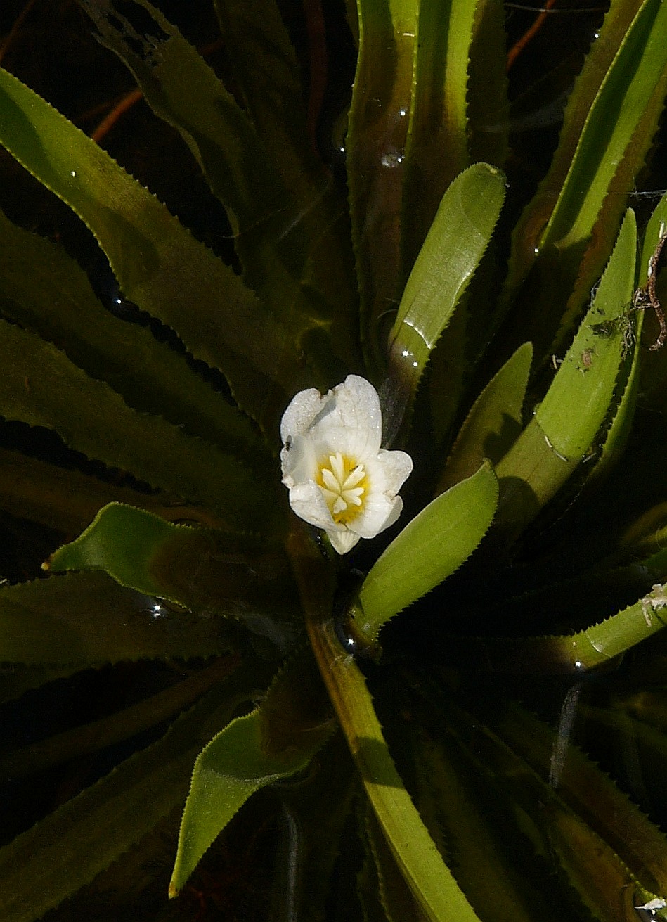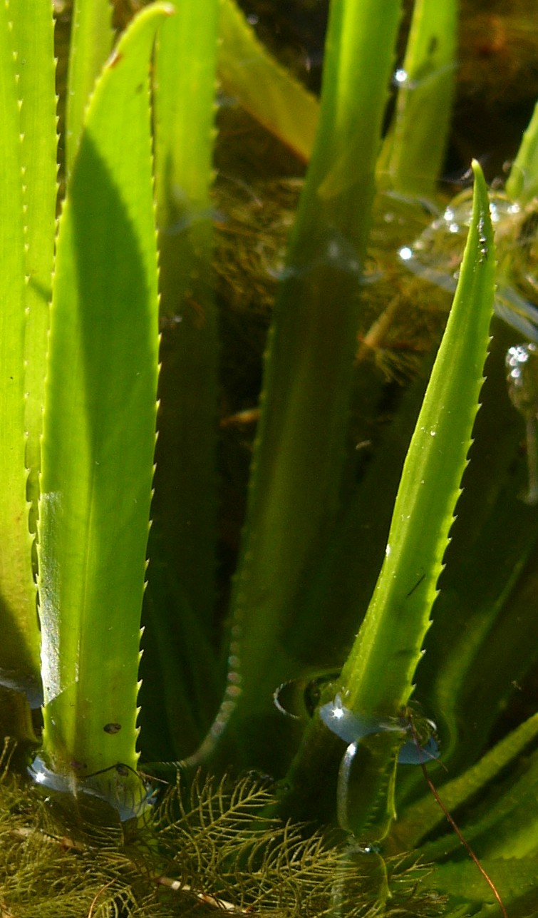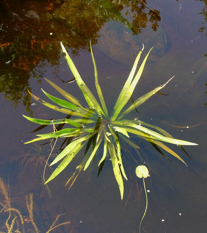 Früchte eiförmig, in der Spatha verborgen Blätter in starren, großen, halbuntergetauchten, frei schwimmenden, dichten, schräg aufwärts gerichteten Rosetten