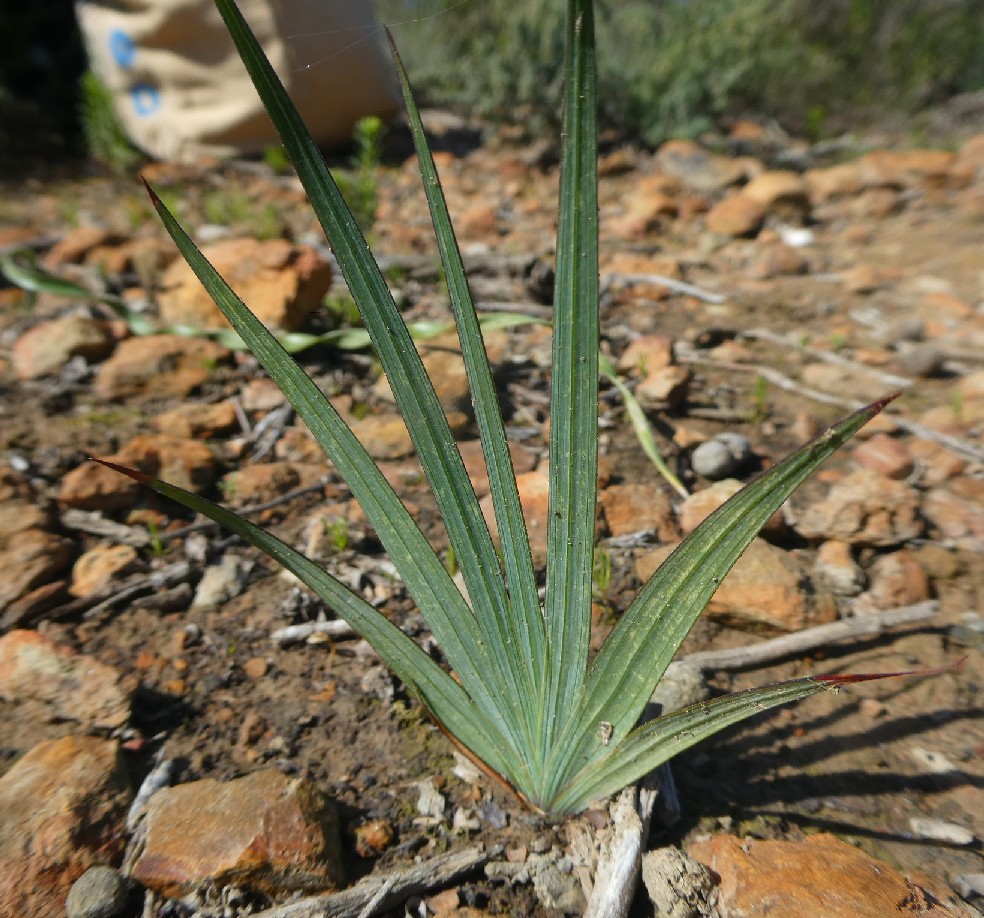 Blätter fächerförmig zu 7 - 10, schwertförmig, reitend, 100 - 300 mm lang, 2 - 7 mm breit, vorne spitz, halb so lang oder fast so lang wie der Stängel