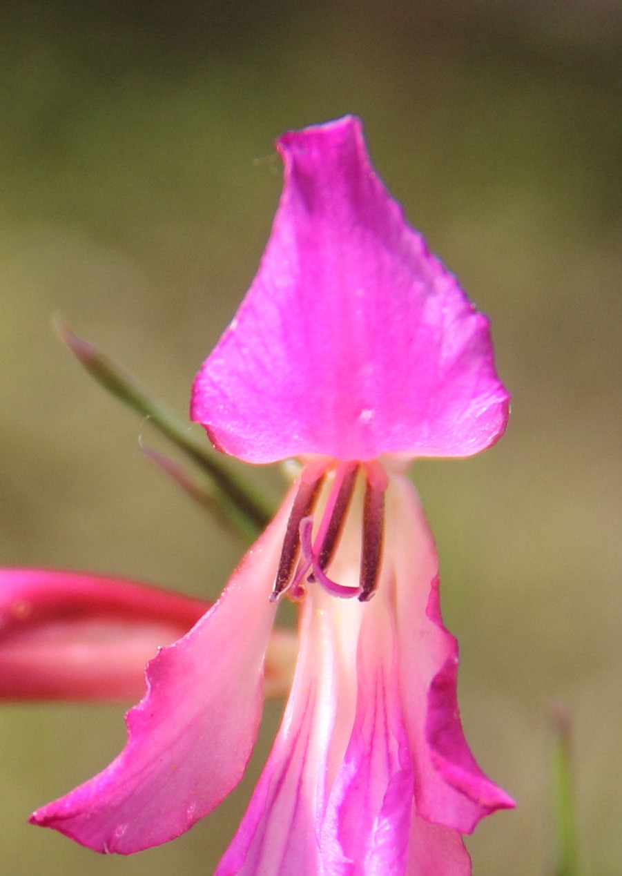 Blüte purpurrot, ca. 30 mm lang, trichterförmig, mit 6 Perigonblättern, die 3 unteren Blütenblätter mit weißem, rot umrandeten Längsstreifen, länger als die oberen