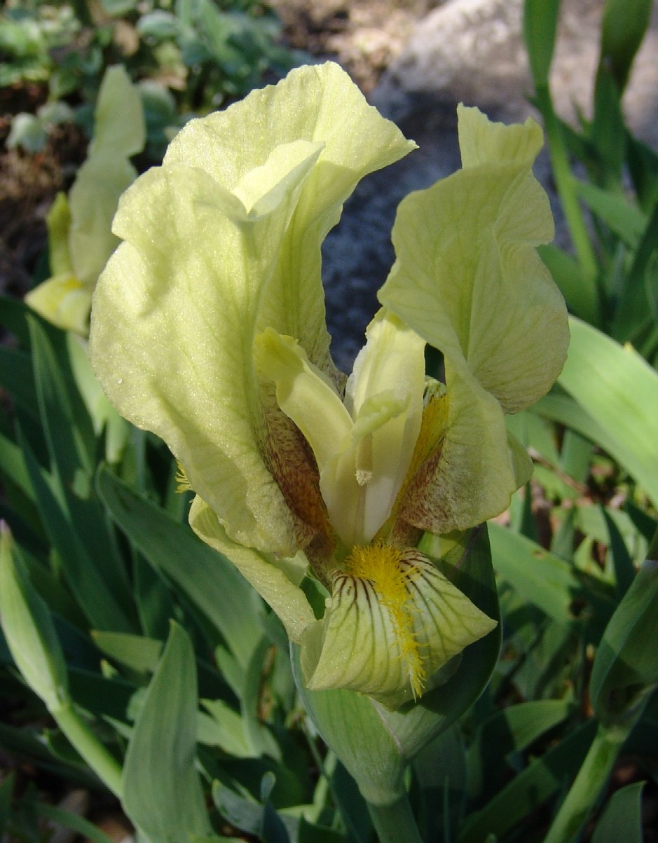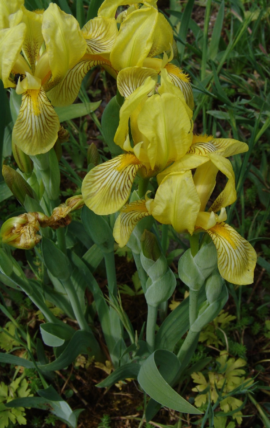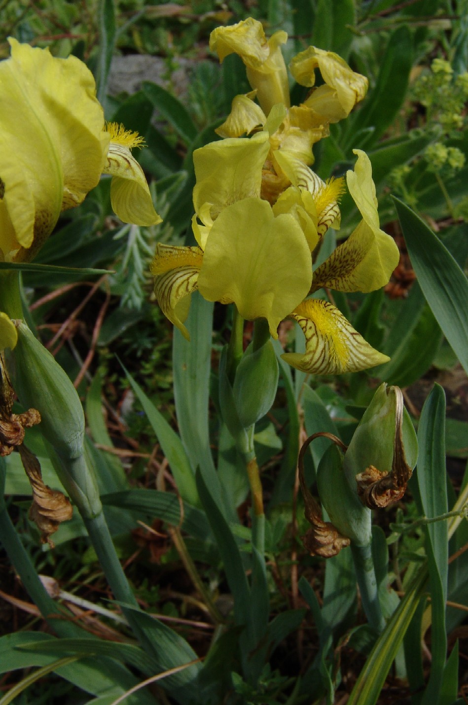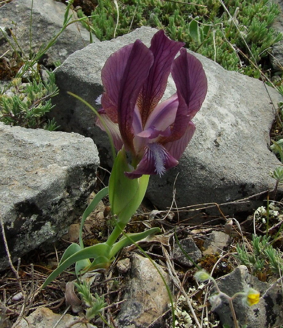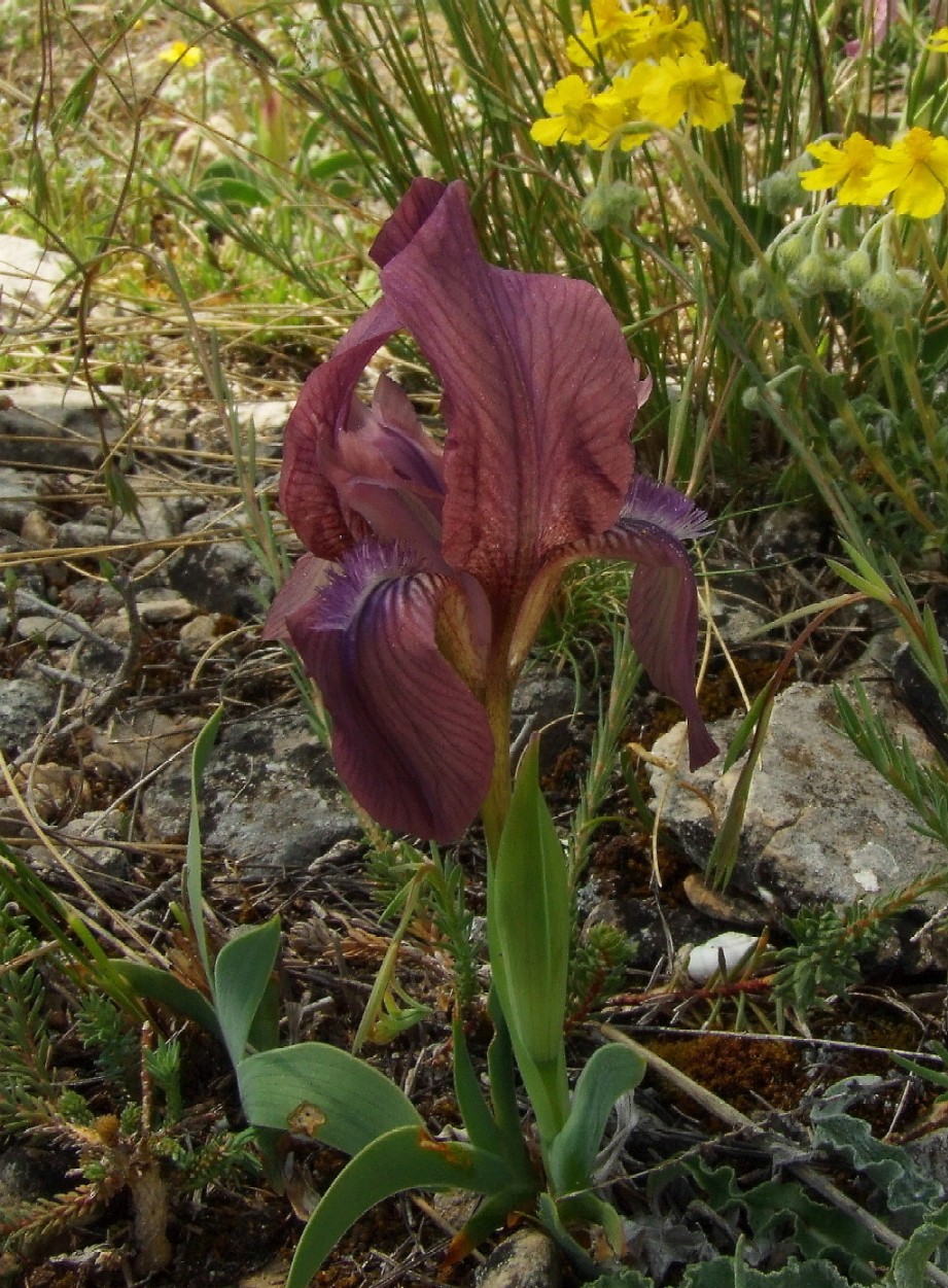 Iris - Pflanze 5 - 30 cm groß, Blüten bräunlichgelb oder rotviolett, mit Bart, Hüllblätter stark gekielt