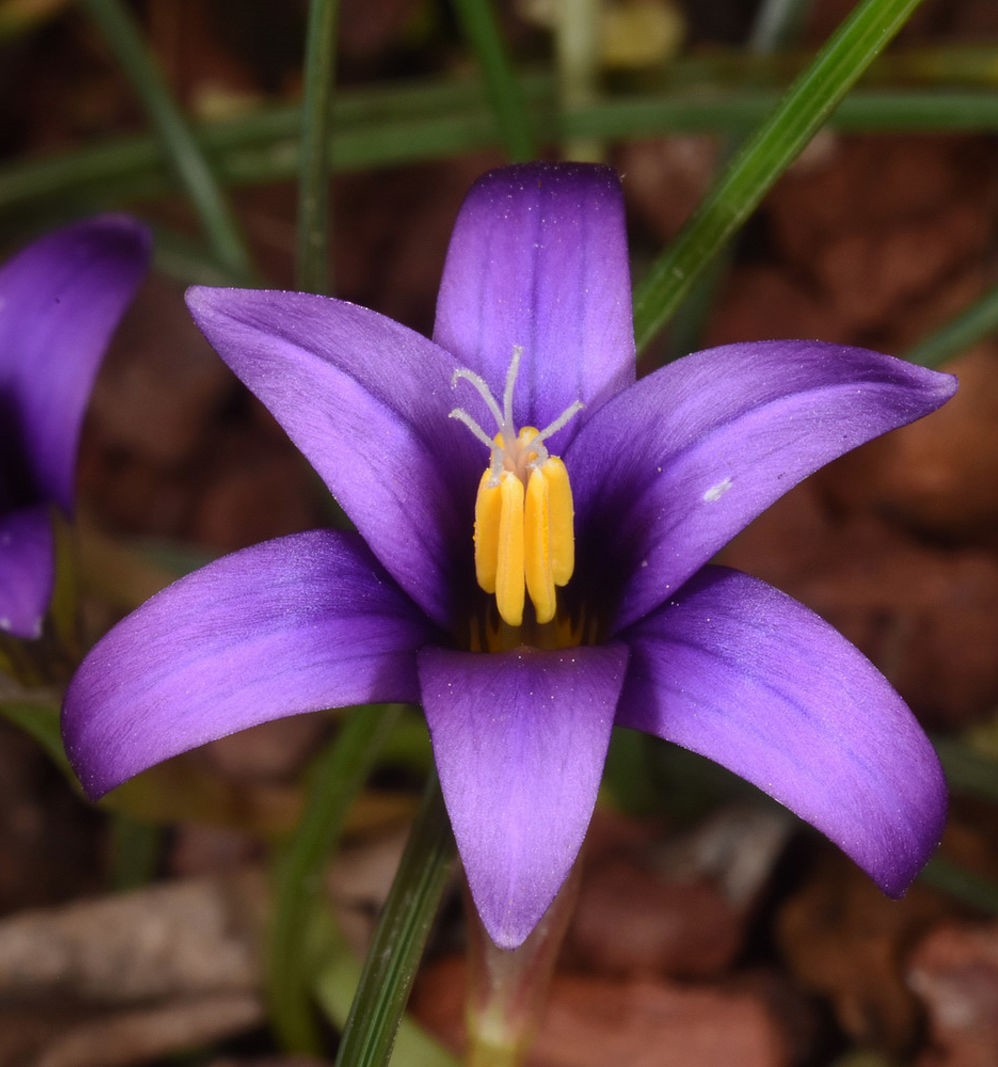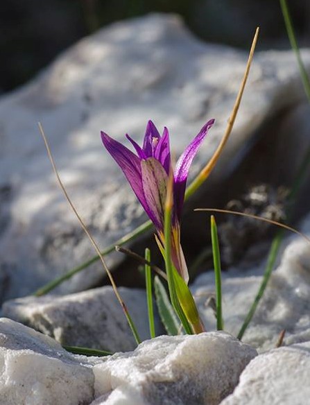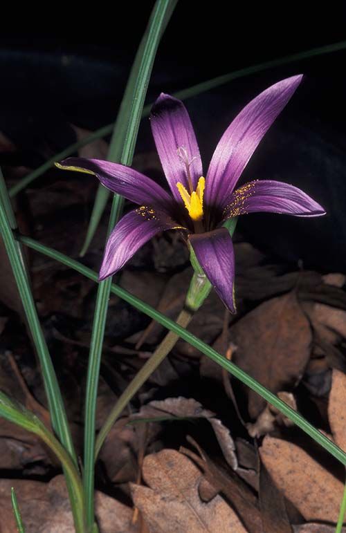Romulea- Blüten dunkelviolett, Schlund nur im unteren Teil gelb, Perigonröhre eng, 8 - 17 mm lang