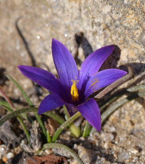 Gattungsmerkmale: Knolle mit braunen, ledrigen, glatten Hüllen, mit 1 - 6 zur Blütezeit kurzen, oft unterirdischen Stängeln, Blüten sitzend oder kurz gestielt, in den Achseln von 2 krautigen Tragblättern (Braktee und Brakteole), 6 im unteren Teil verwachsen Perigonblätter, 3 freie Staubblätter, Filamente kahl oder am Grund behaart, Griffel meist mit 6 fadenförmigen Ästen, Fruchtknoten aus 3 Fruchtblättern, Früchte vielsamig, oberirdisch, mit 4 - 8 Blättern, wobei die 2 grundständigen deutlich länger sind als die stängelständigen, Blätter pfriemlich, +/- rundlich, gerillt, 1 - 2 mm im Durchmesser, kahl, ohne weißen Mittelstreif. |