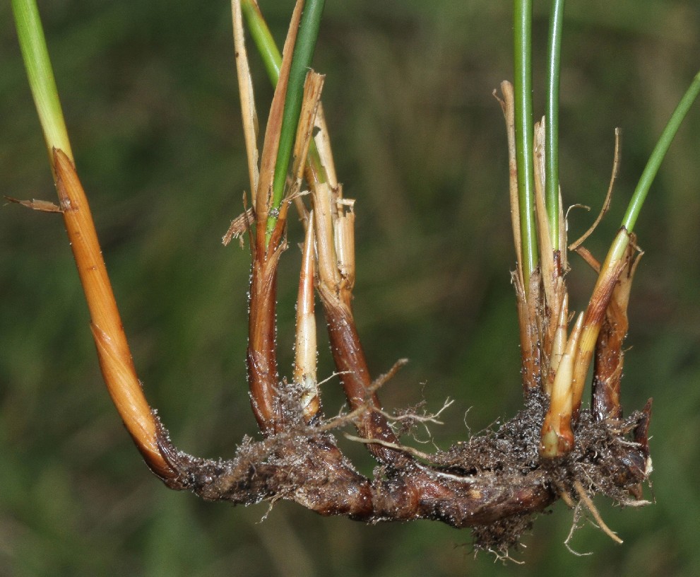 Pflanze mit langem, kriechendem Rhizom, zwischen den Stängel bleiben stets deutliche Zwischenräume, Stängelbasis mit hellbraunen, glänzenden, spreitenlosen Blattscheiden