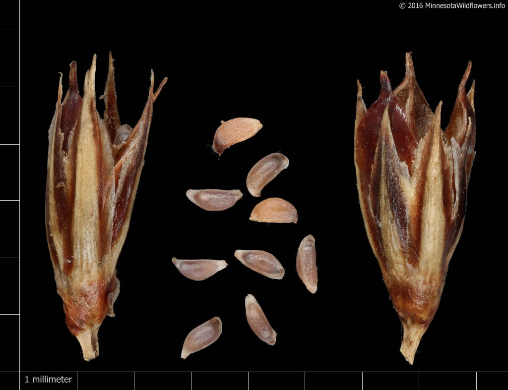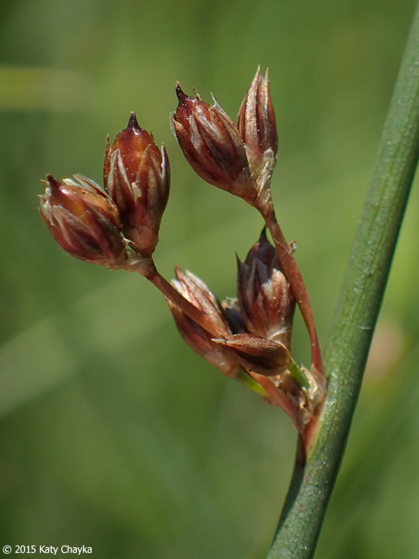 Stängel glatt, nicht gerillt Mit mit 6 Perigonblättern, Perigonblättern 4 - 5 mm lang, dunkelbraun, mit grünem Mittelstreif, am Rand durchscheinend häutig, 3 rosafarbene Griffel, 6 Staubblätter, Staubbeutel deutlich länger als die Staubfäden