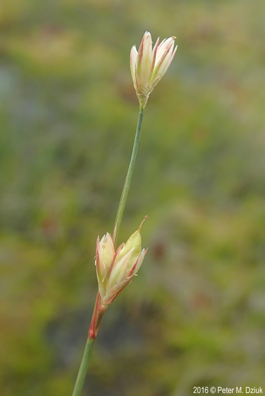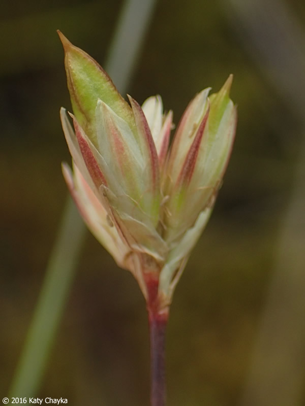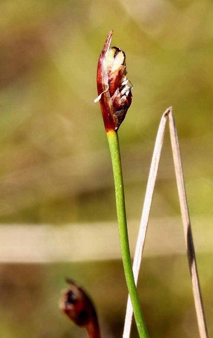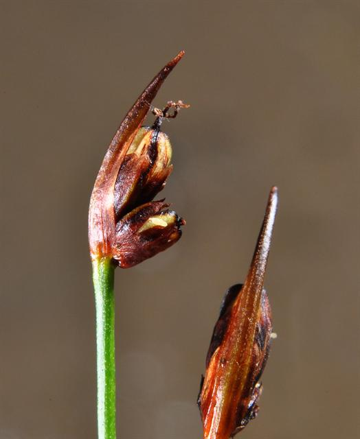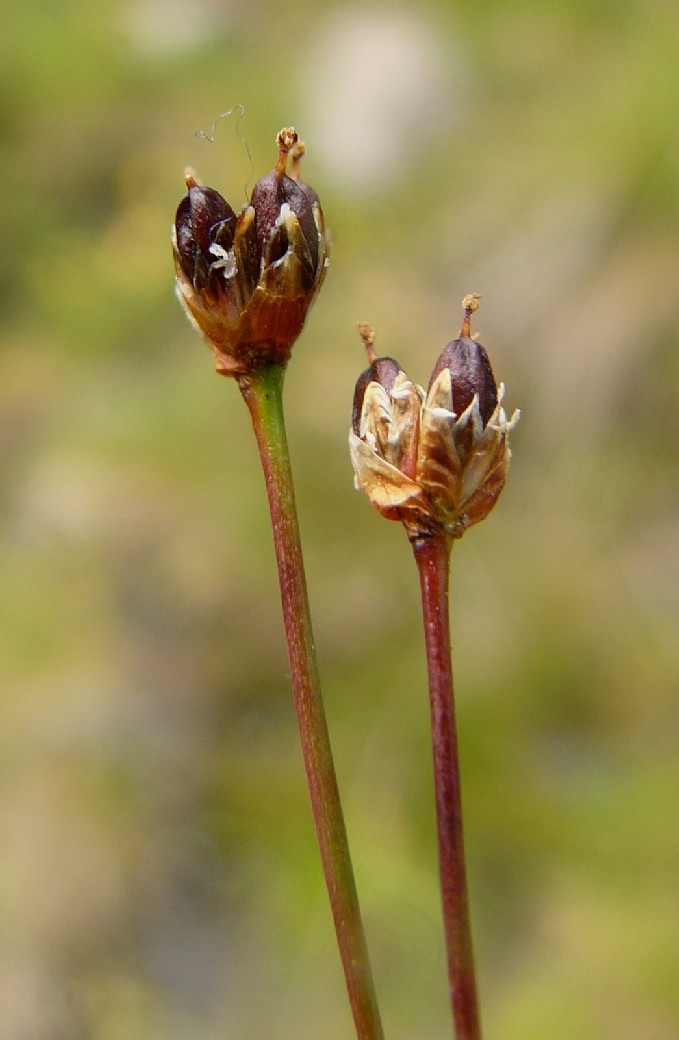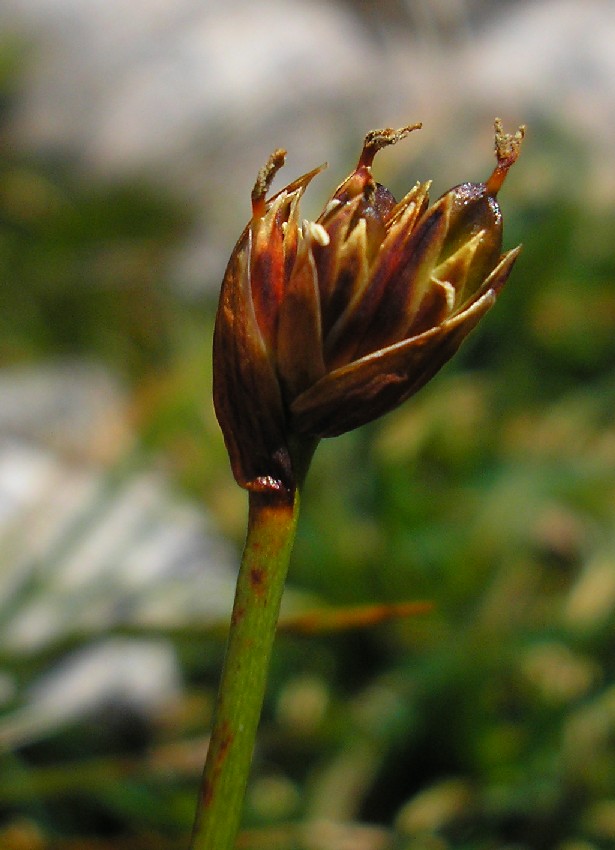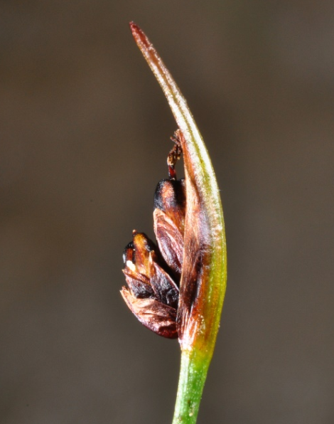 Ältere Perigonblätter bräunlich, mit hellem Rand, die äußeren 2 oder 3 Tragblätter der Blüten bilden eine Hülle um das Köpfchen, alle Tragblätter stumpf, kürzer als die Perigonblätter
