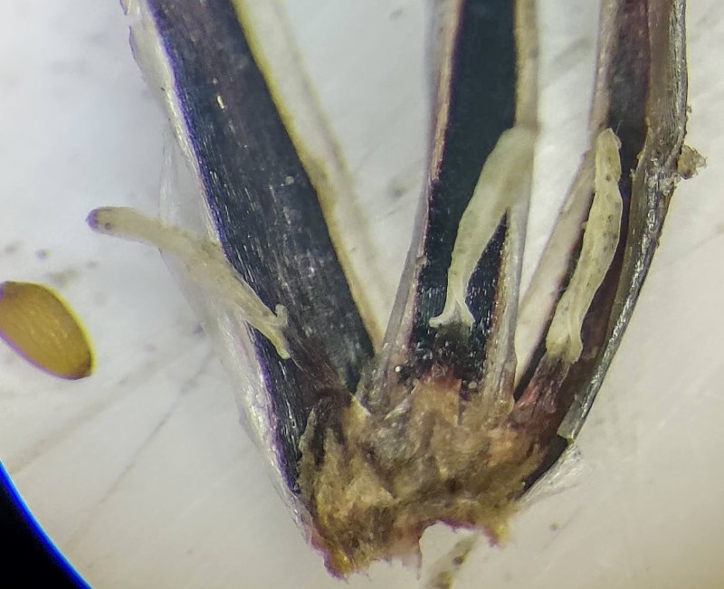 Staubblätter 6, Staubbeutel 0,7 - 1,6 mm lang, Filamente 0,4 - 1,3 mm lang, Griffel 0,2 - 0,5 mm lang, Narben 0,5 - 1 mm, korkenzieherartig gedreht