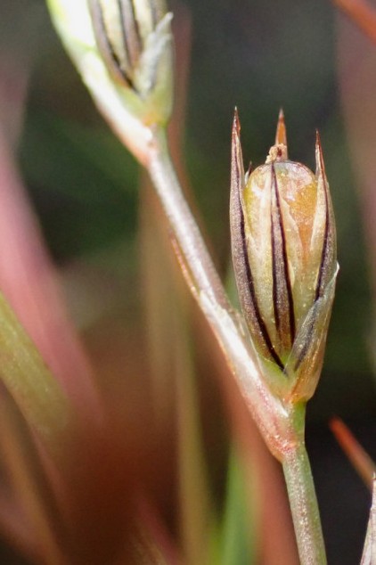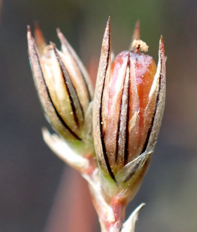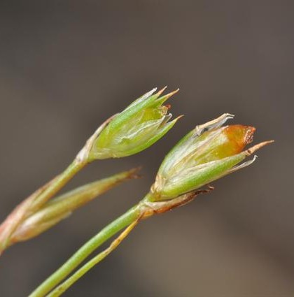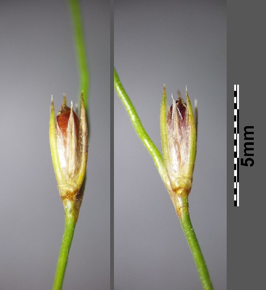 Perigonblätter 3 - 4 mm lang, in der Mitte mit rötlicher Bande, am Rand häutig, äußere Perigonblätter spitz, innere Perigonblätter stumpf oft fast vollständig häutig, meist länger als die Kapsel Kapsel 3 - 4 mm lang, kegelförmig, kürzer oder länger als die