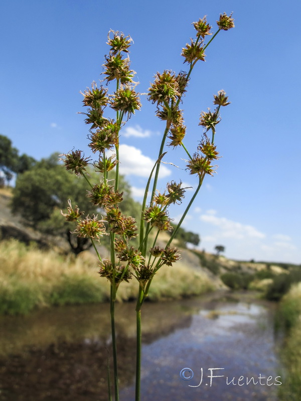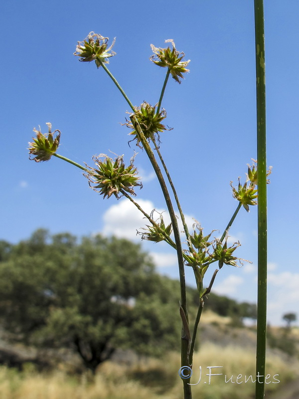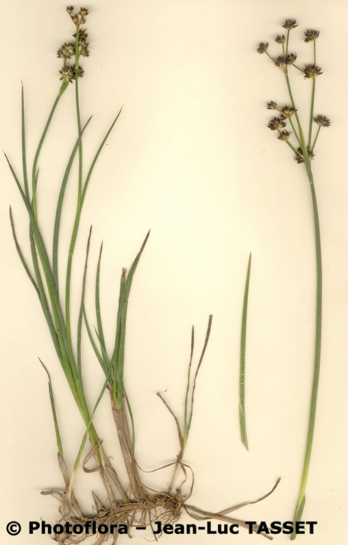Juncus - Pflanze 25 - 100 cm hoch, mit 10 - 50 Köpfchen, Stängel beblättert, der unverzweigte untere Teil deutlich länger als der obere blütentragende, Blütenstände vielblütig, endständig, Blätter rund oder oval, au längsippig, im Querschnitt einröhrig