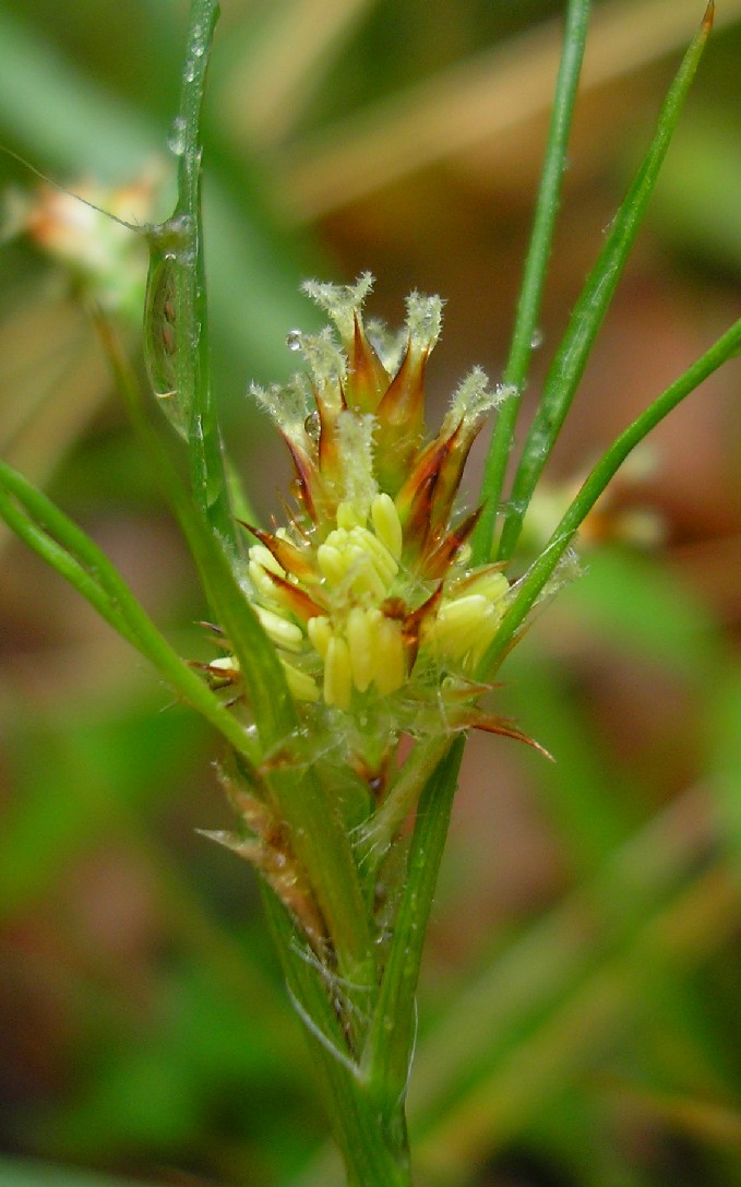 Blütenstand mit 6 - 11 Köpfchen mit je 8 - 10 Blüten Perigonblätter strohfarben, ca. 2,5 mm lang, +/- gleich lang Staubbeutel 0,5 - 0,8 mm lang, Filamente 1,2 - 1,6 mm lang, Kapsel braun, ca. 2 mm lang,