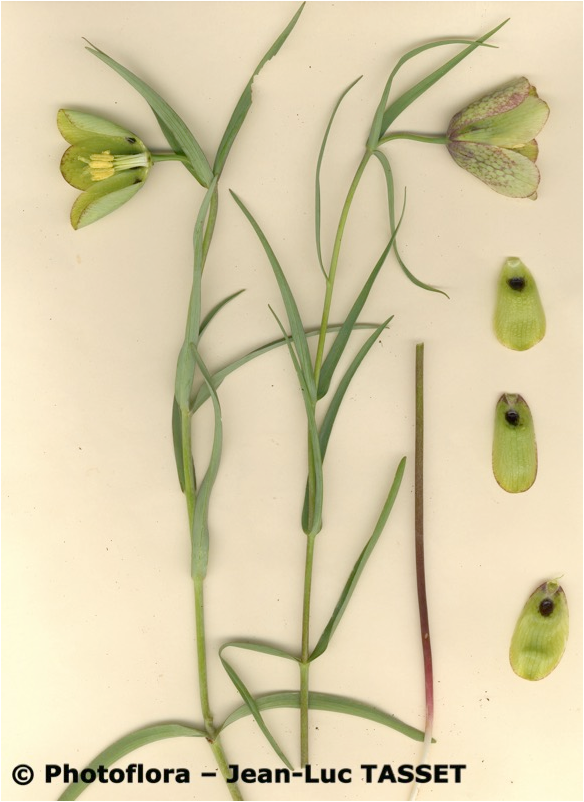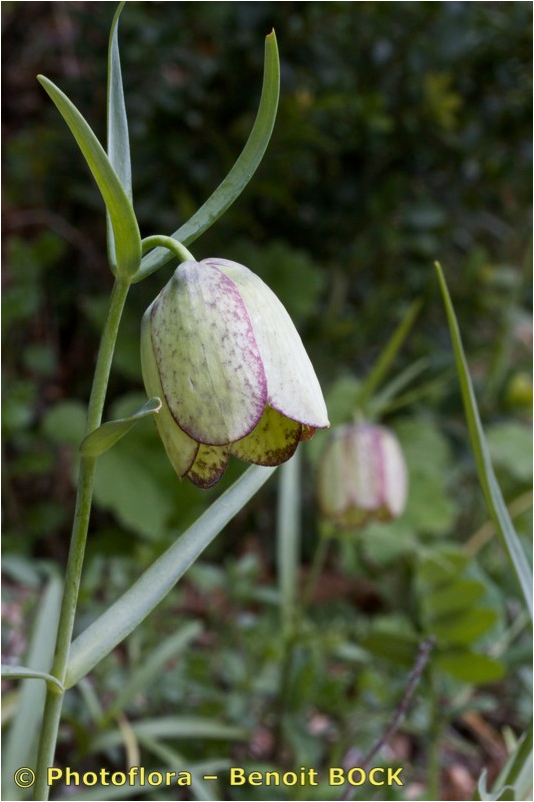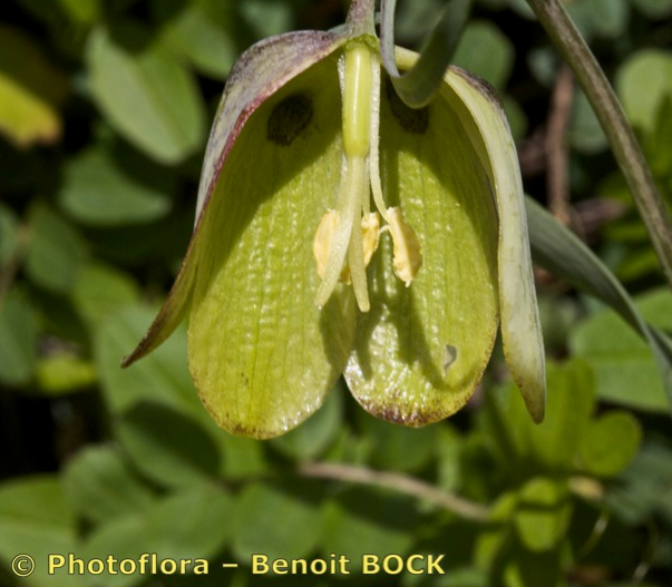 Blüten hängend, breit glockig, grün, mit braunrotem Schachbrettmuster