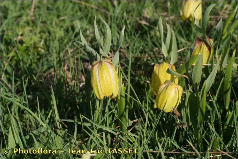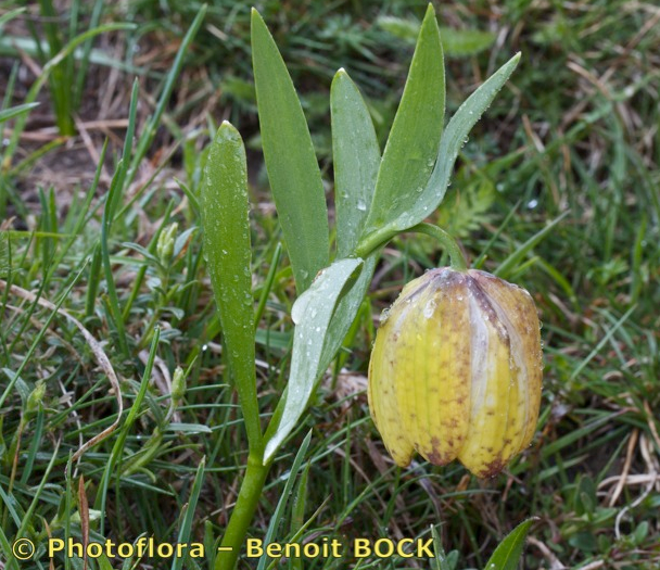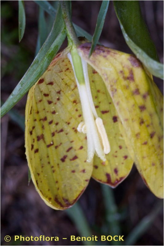 Blüten meist einzeln, seltener zu zweit, glockig, hängend, gelb, mit braunem Schachbrettmuster, am Hals eckig, dadurch im Umriss rechteckig erscheinend, Perigonblätter 40 - 45 mm lang, vorne stumpf, oft bereift