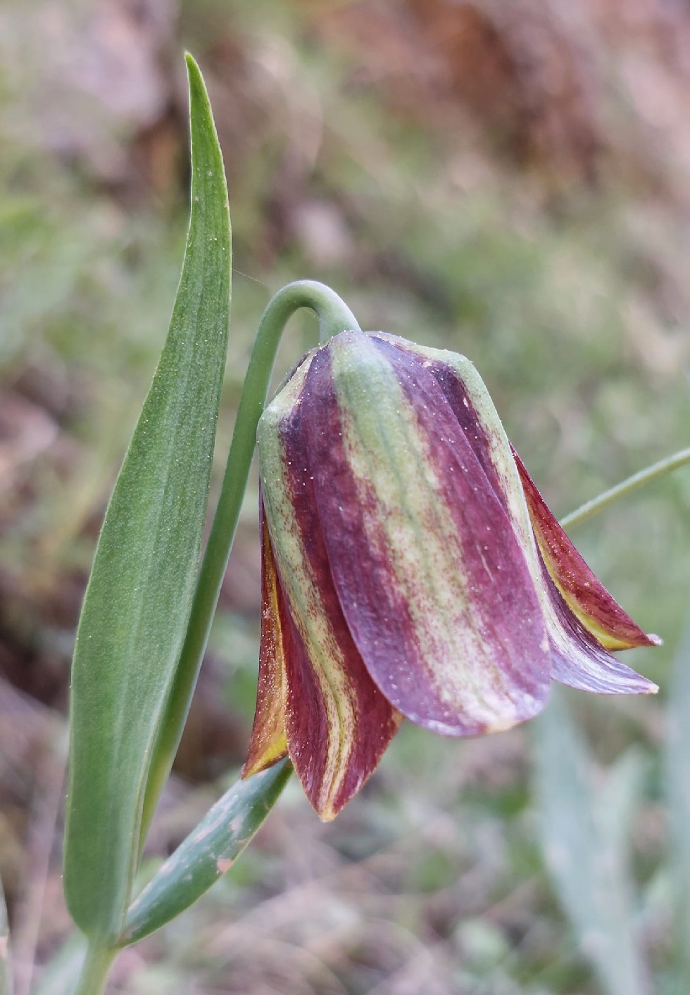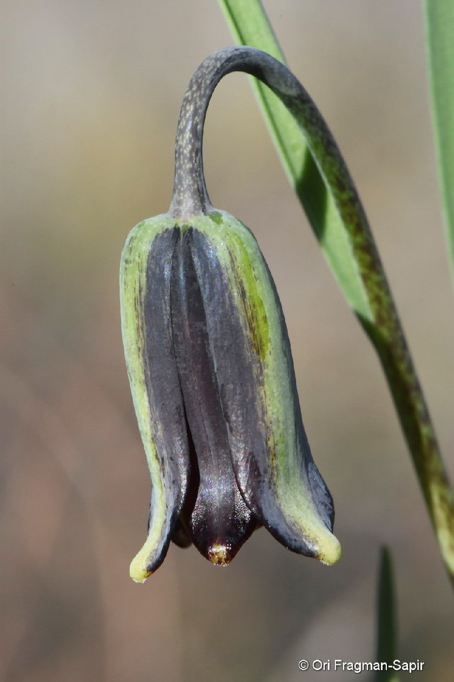 Blüten hängend, mit 1 Tragblatt, zylindrisch, purpurbraun, mit deutlichem grünem Mittelstreifen, ohne Schachbrettmuster