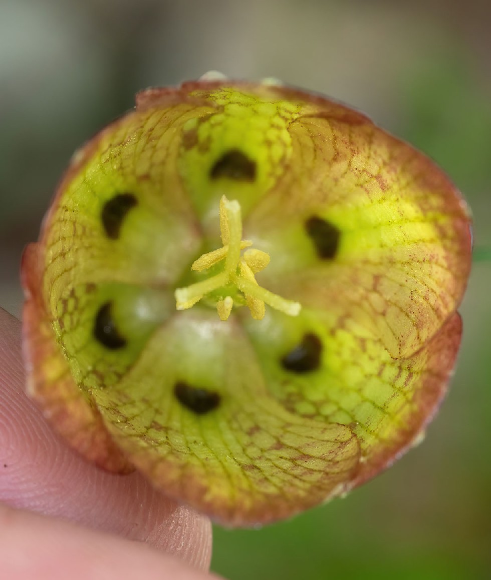 Blüten hängend, breit glockig, vollständig grün oder rötlich, mit grünem Mittelstreifen