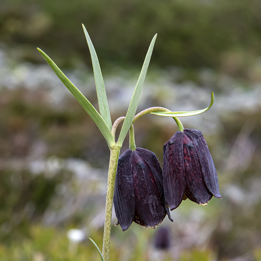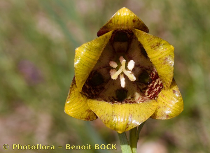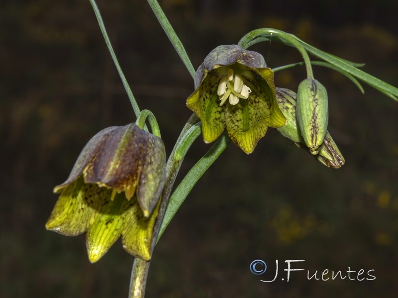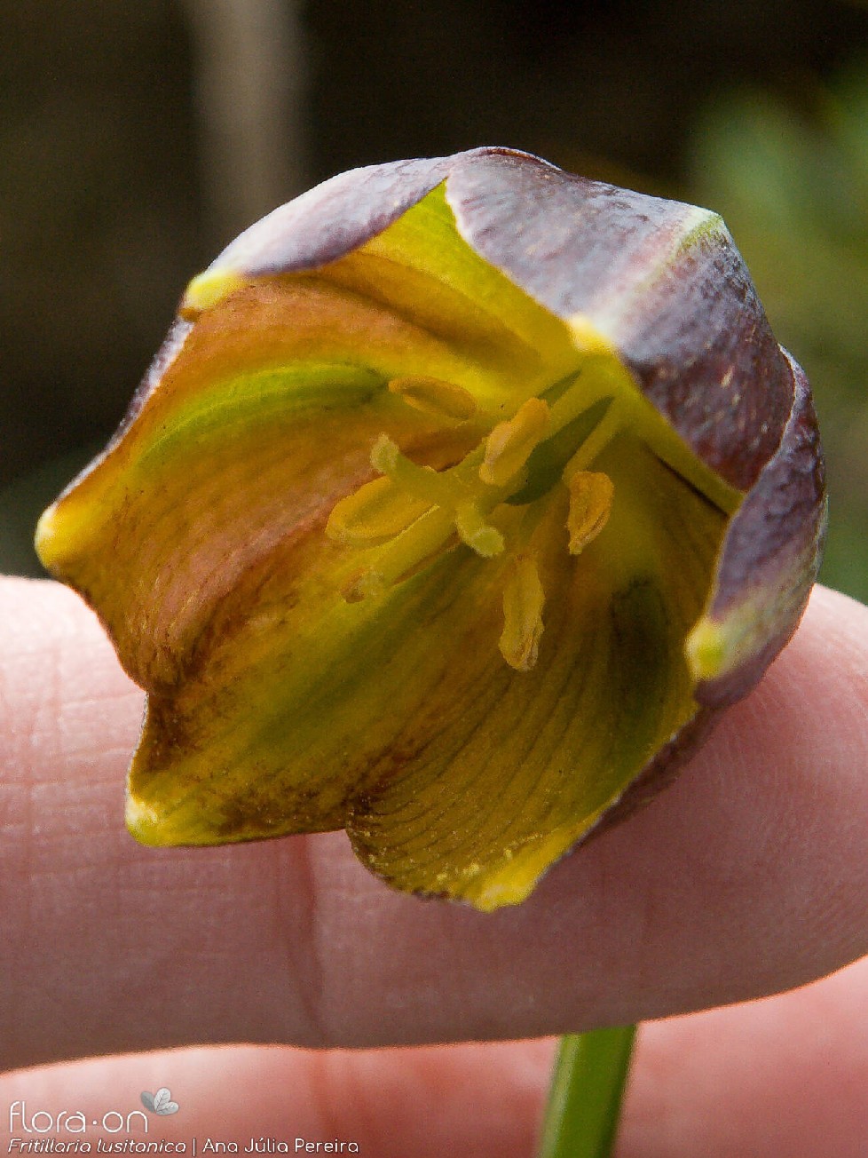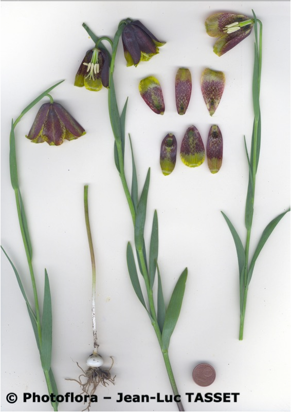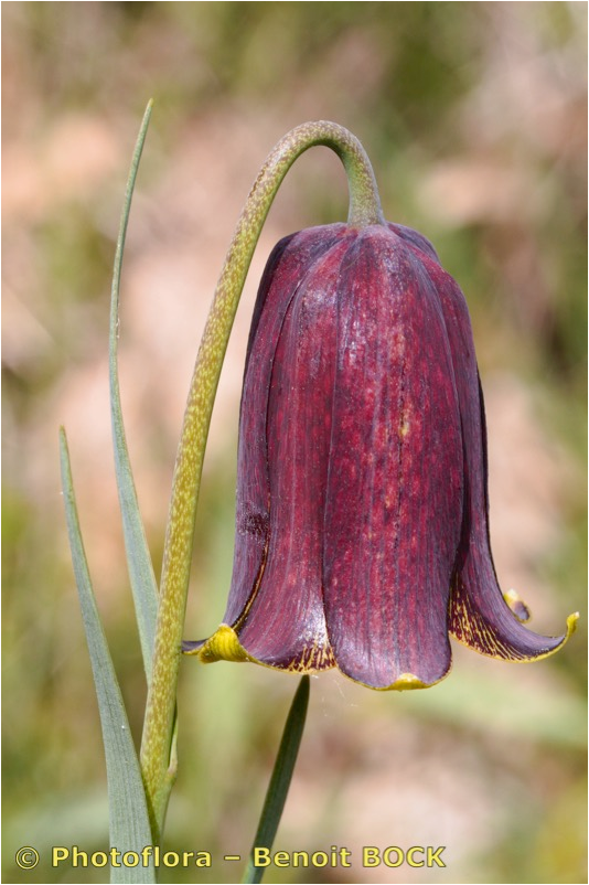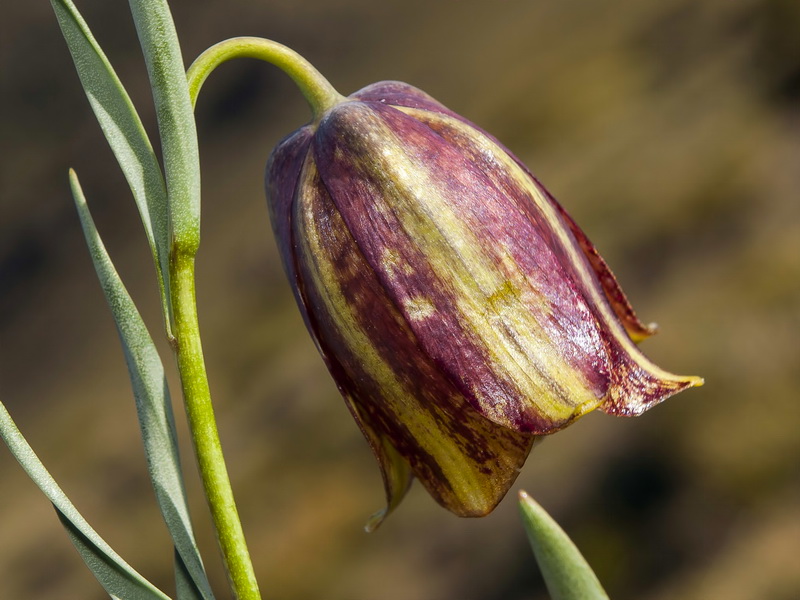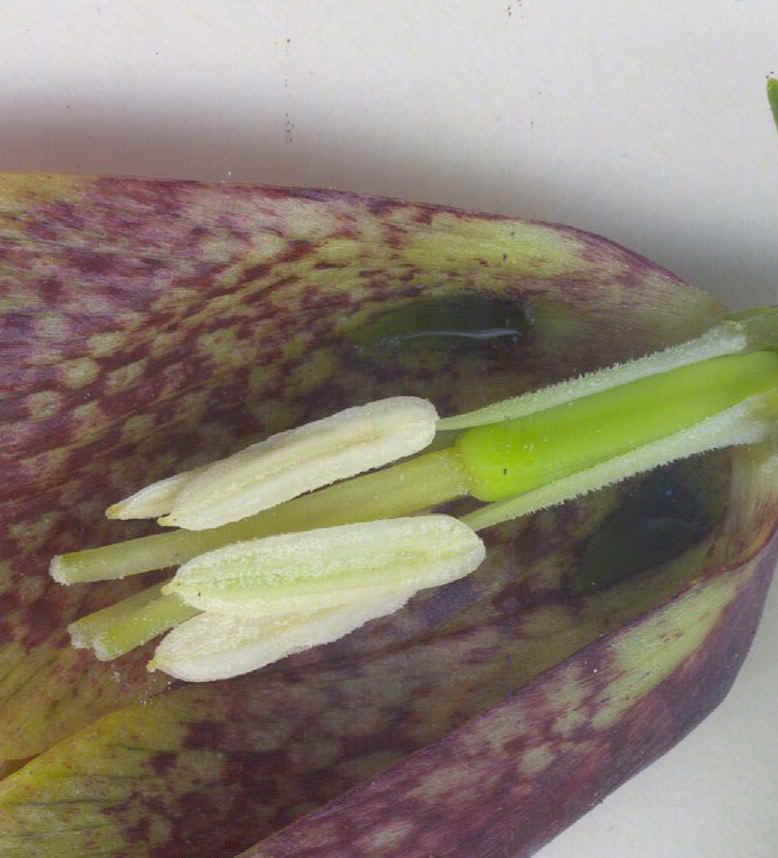 Blüten glockig, außen purpurbraun, manchmal mit gelbem oder grünem Mittelstreifen, oft mit Schachbrettmuster, Spitze der Perigonblätter meist umgebogen