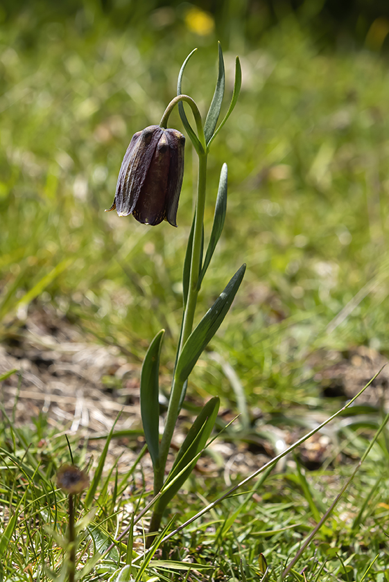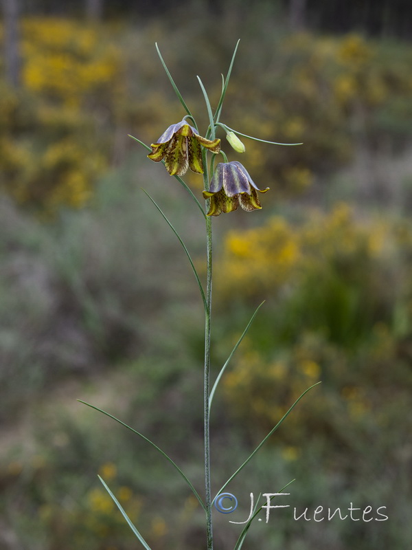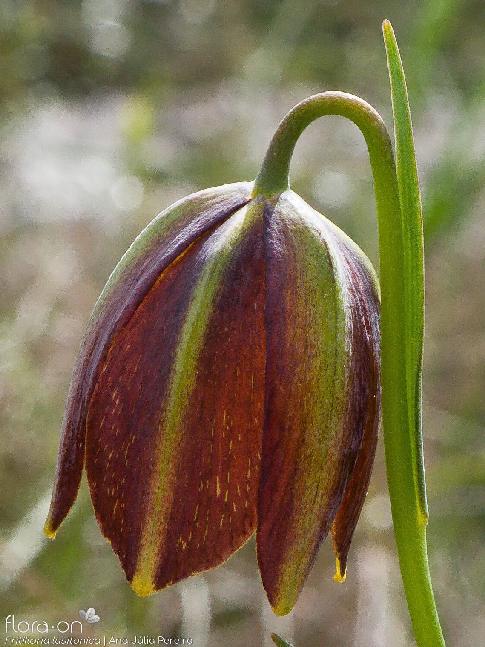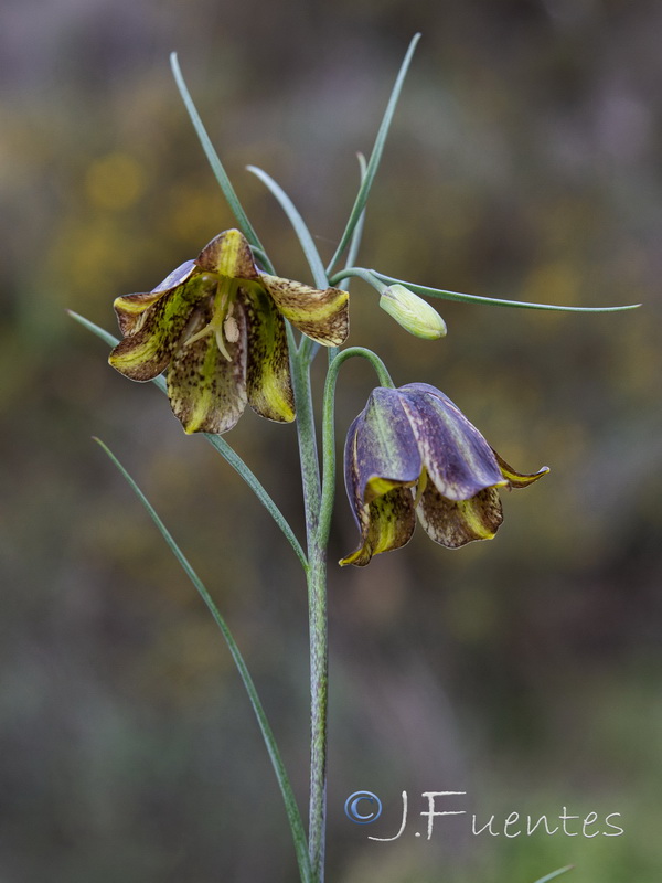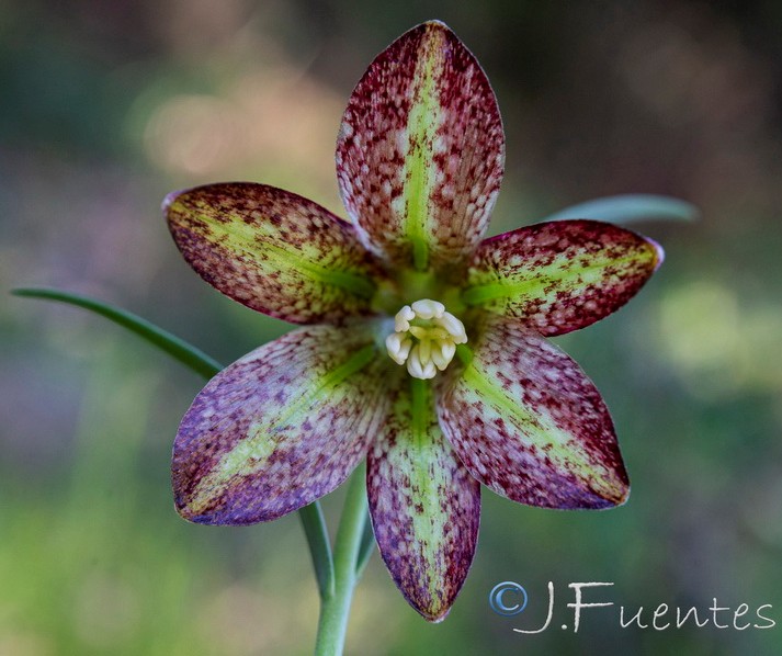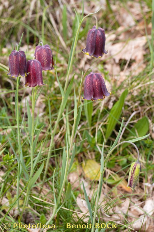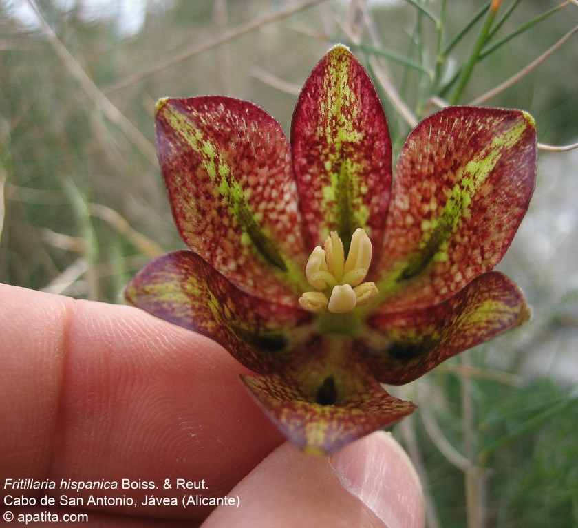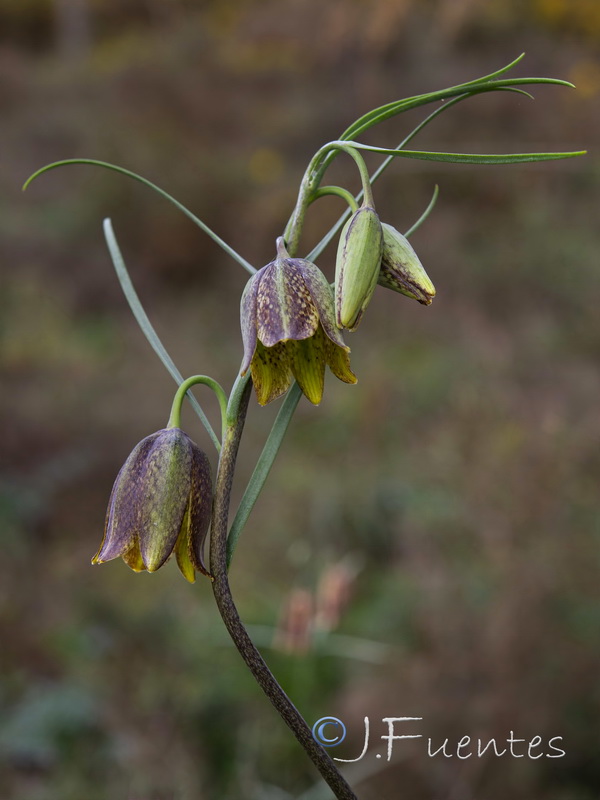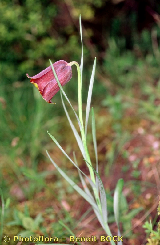 Blüten glockig, außen purpurbraun, manchmal mit gelbem oder grünem Mittelstreifen, oft mit Schachbrettmuster, Spitze der Perigonblätter meist umgebogen
