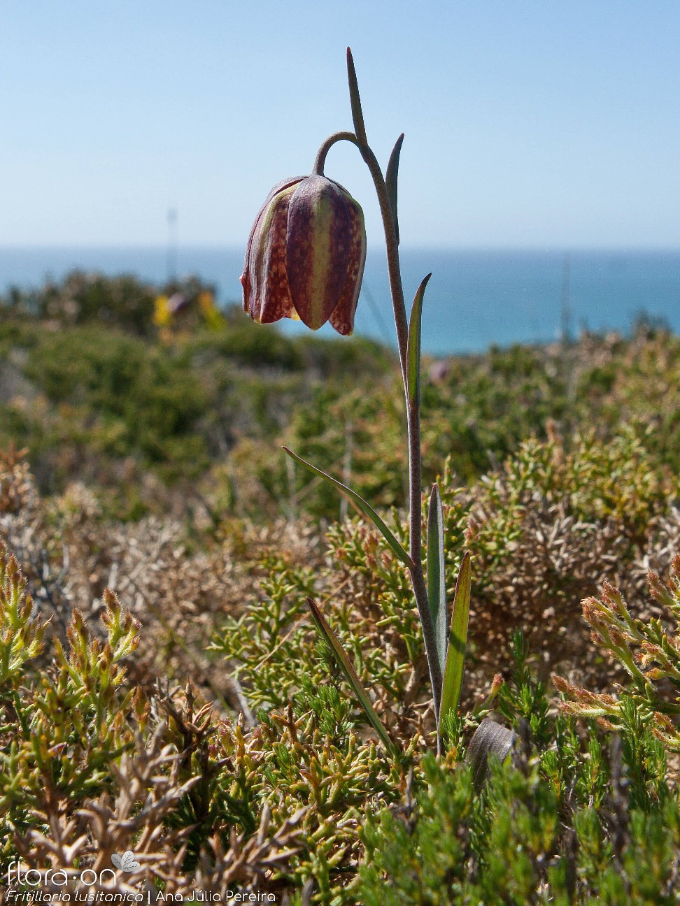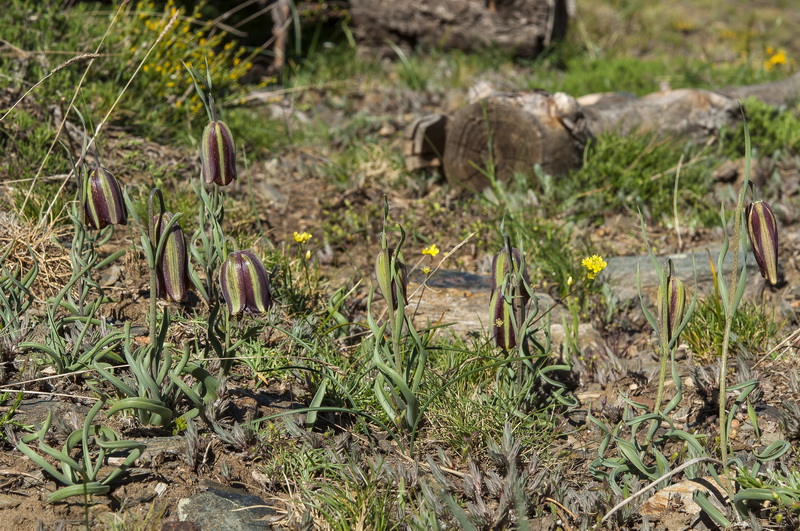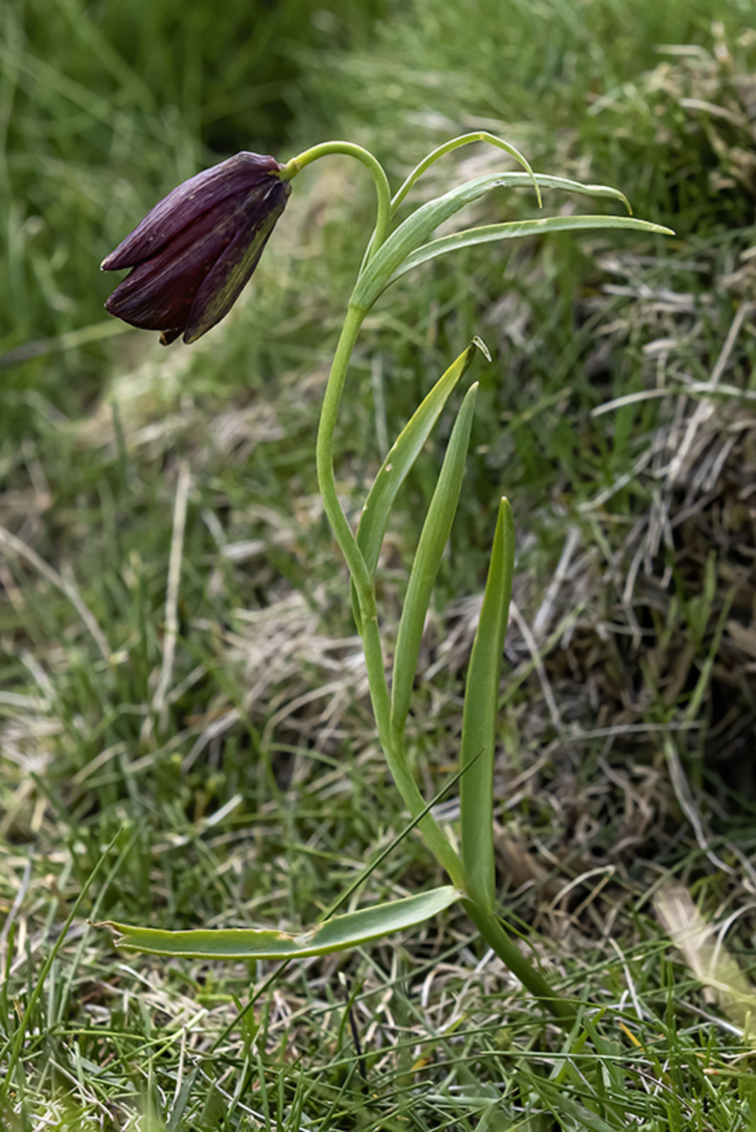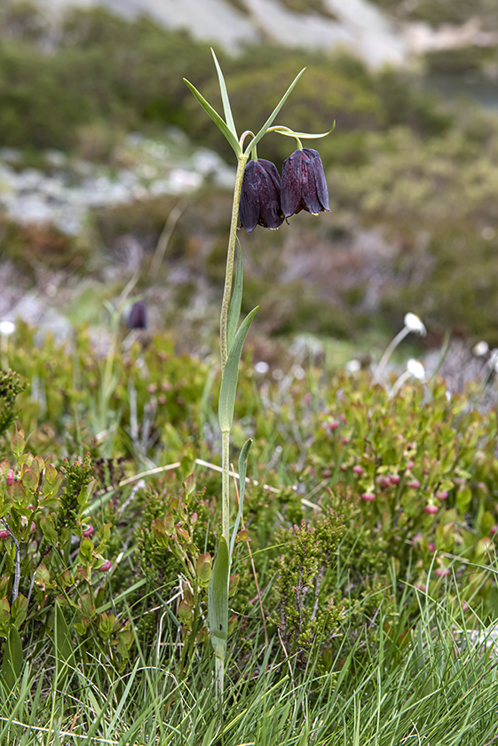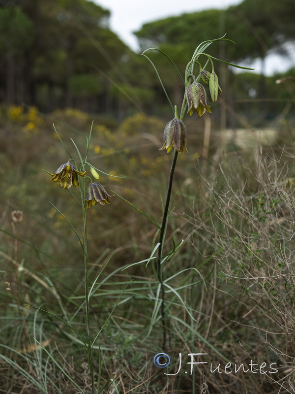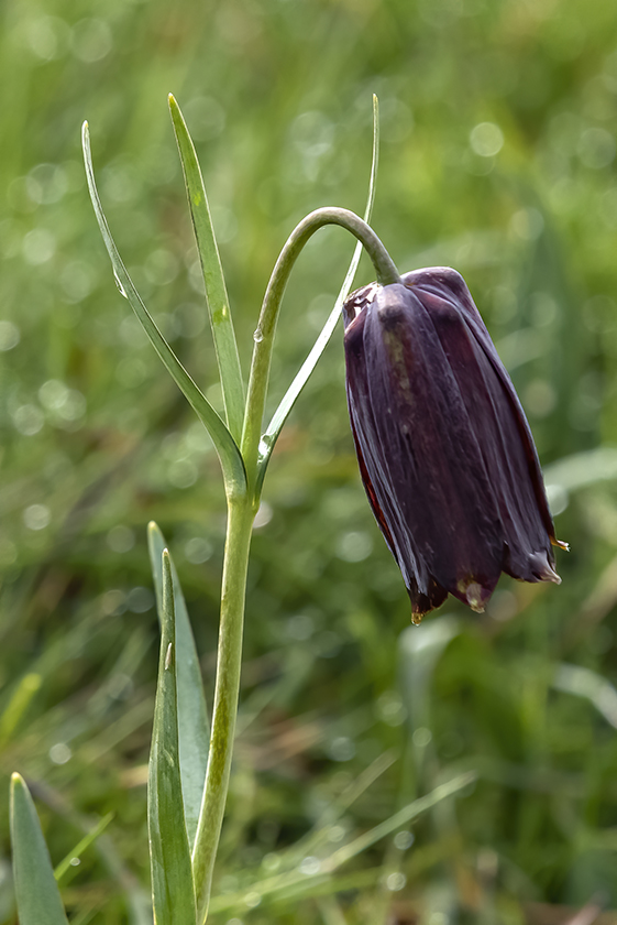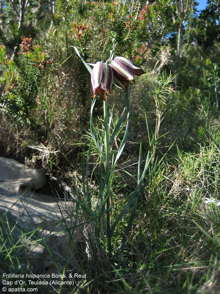 Blüten glockig, außen purpurbraun, manchmal mit gelbem oder grünem Mittelstreifen, oft mit Schachbrettmuster, Spitze der Perigonblätter meist umgebogen