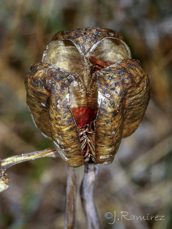 Kapsel ca. 18 mm lang, 11 mm breit, mit 3 Fächern, vielsamig
