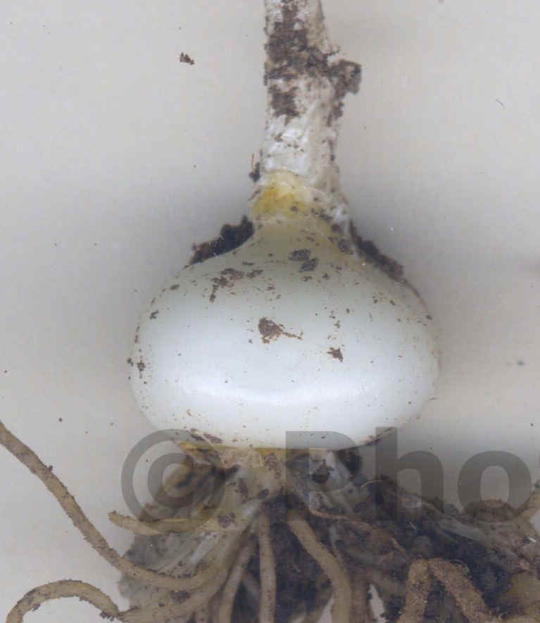 Zwiebel kugelig, 1 - 2,5 cm im Durchmesser, Hüllen weiß