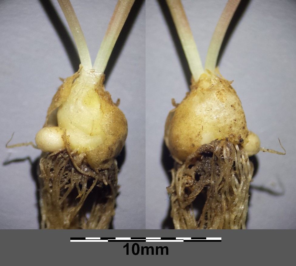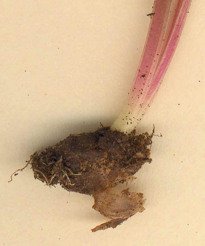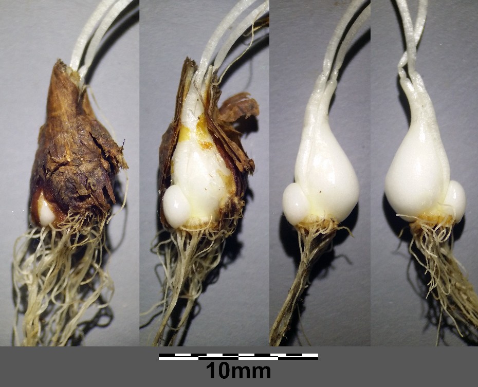 Zwiebel 5 - 7 mm lang, 4 - 6 mm breit, aufrecht,