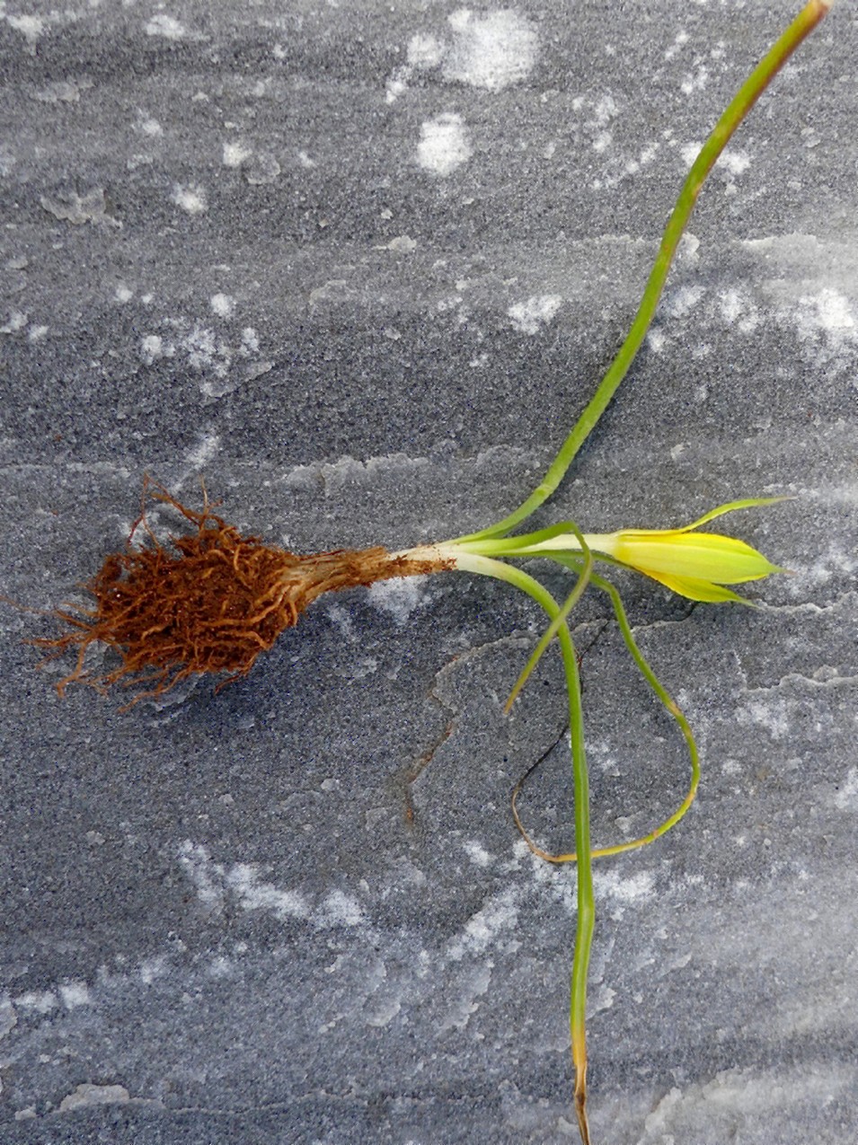Zwiebeln groß (15 mm lang, 7 mm breit, eiförmig, von dicken Wurzeln eingehüllt, oft mit kurzem Nacken aus Hüllen