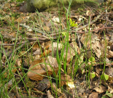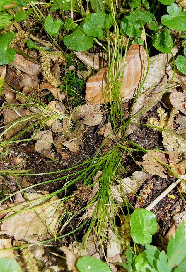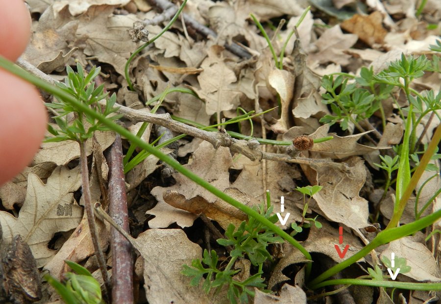 Mit 2 Grundblättern (weiße Pfeile), Grundblätter fädlich, kaum breiter als 1 mm, oberseits flach, schwach röhrig, mit 3 Leitbündeln
