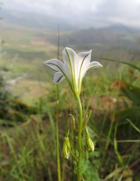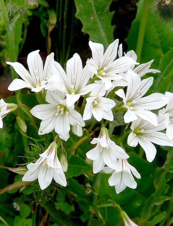 Blüten weit trichterförmig, weiß, innen und außen dunkel geadert