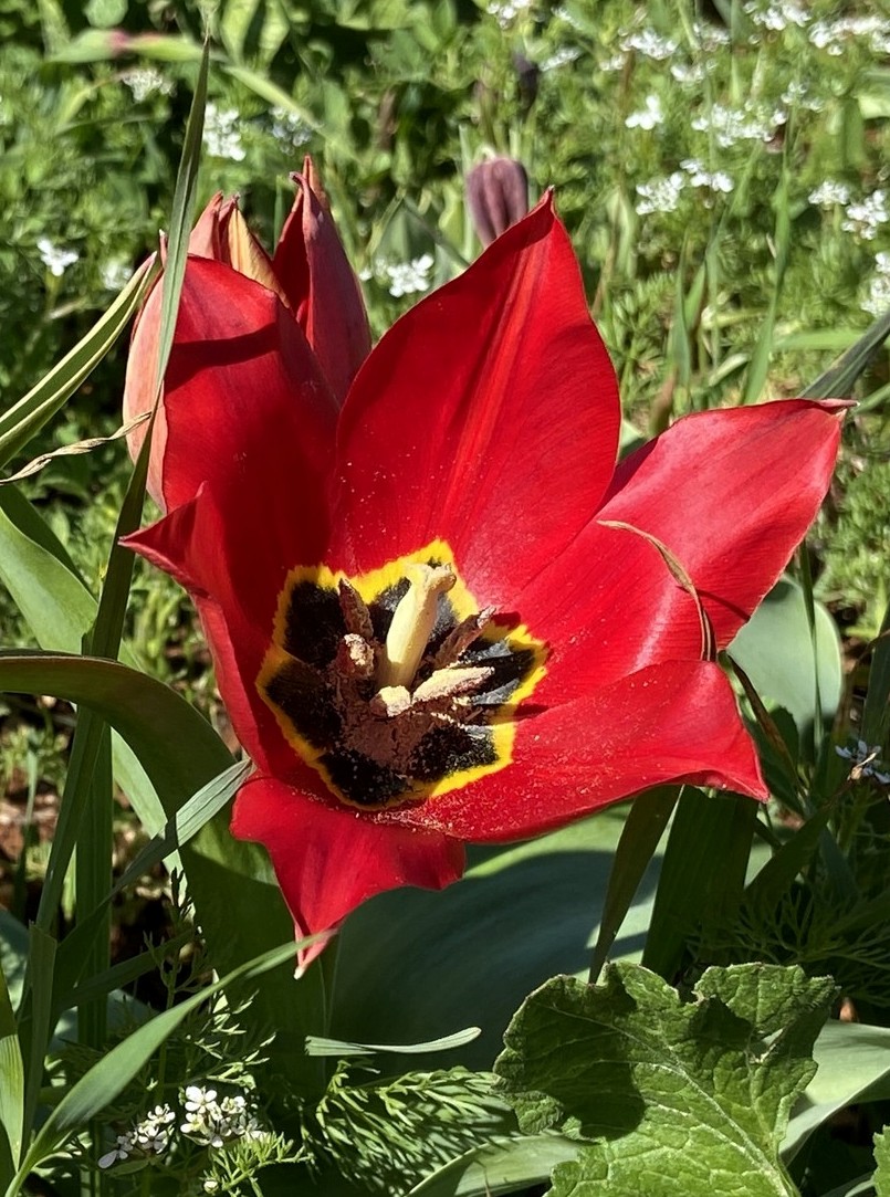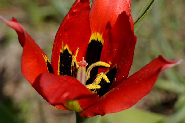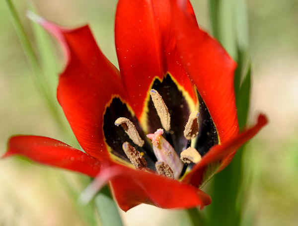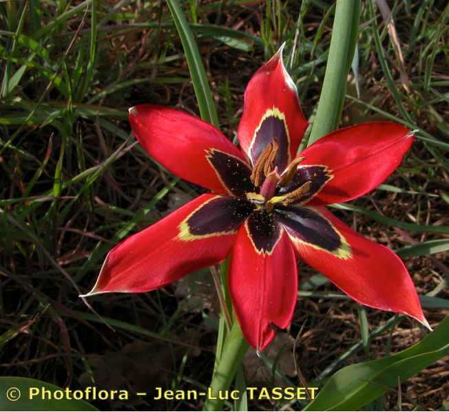 Blüten einzeln, aufrecht, glockig, Perigonblätter spitz, rot, mit schwarzem, gelb umrandeten Grund, Perigonblätter fast gleich 50 - 100 mm lang, 22 - 35 mm breit